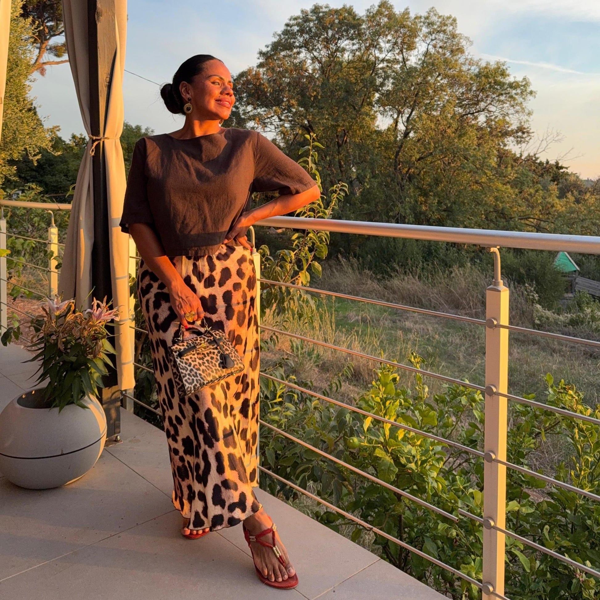 Confectionnée dans une teinte chocolat profonde et chaleureuse, elle se porte aussi bien avec une jupe imprimée qu’un pantalon chic ou décontracté.