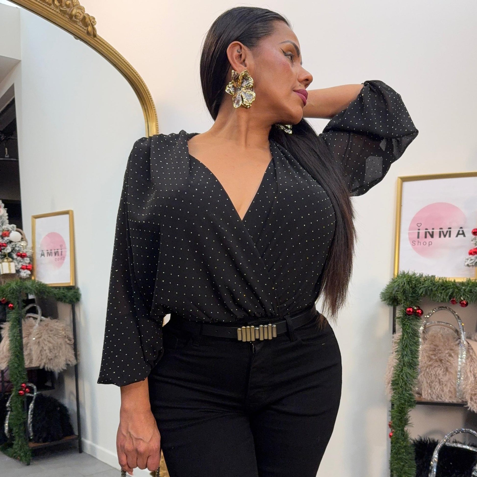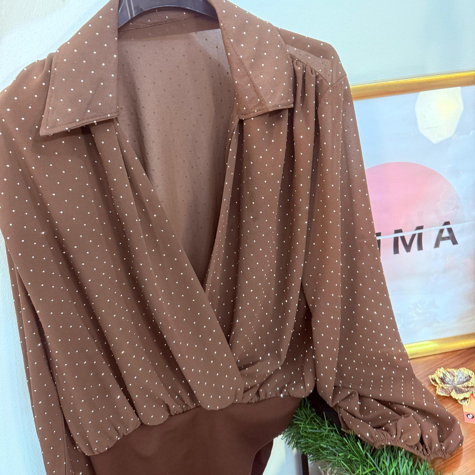 Body croisé au décolleté flatteur, orné de micro-pois pour une allure chic et féminine.