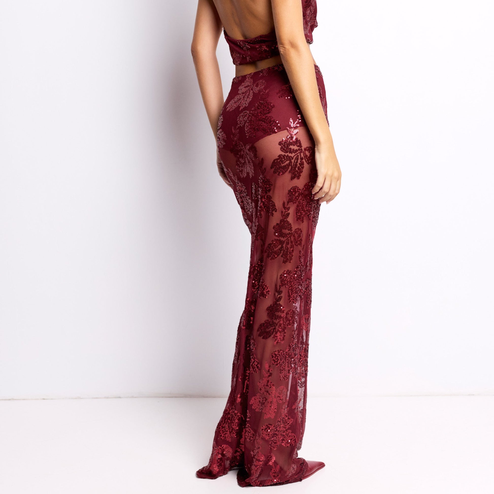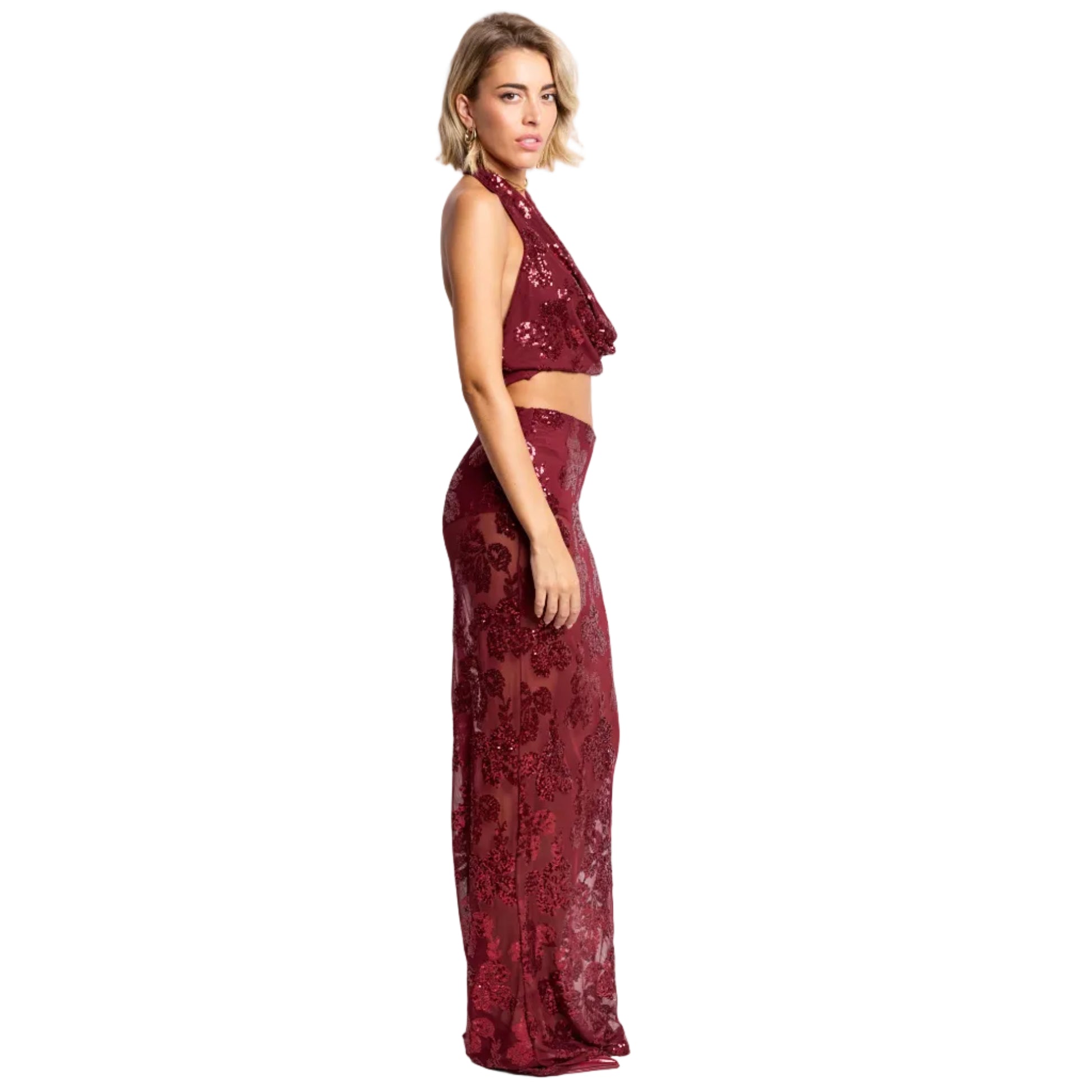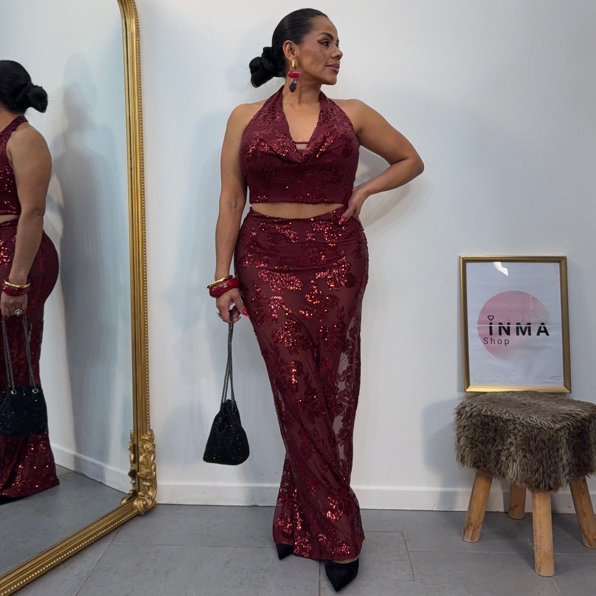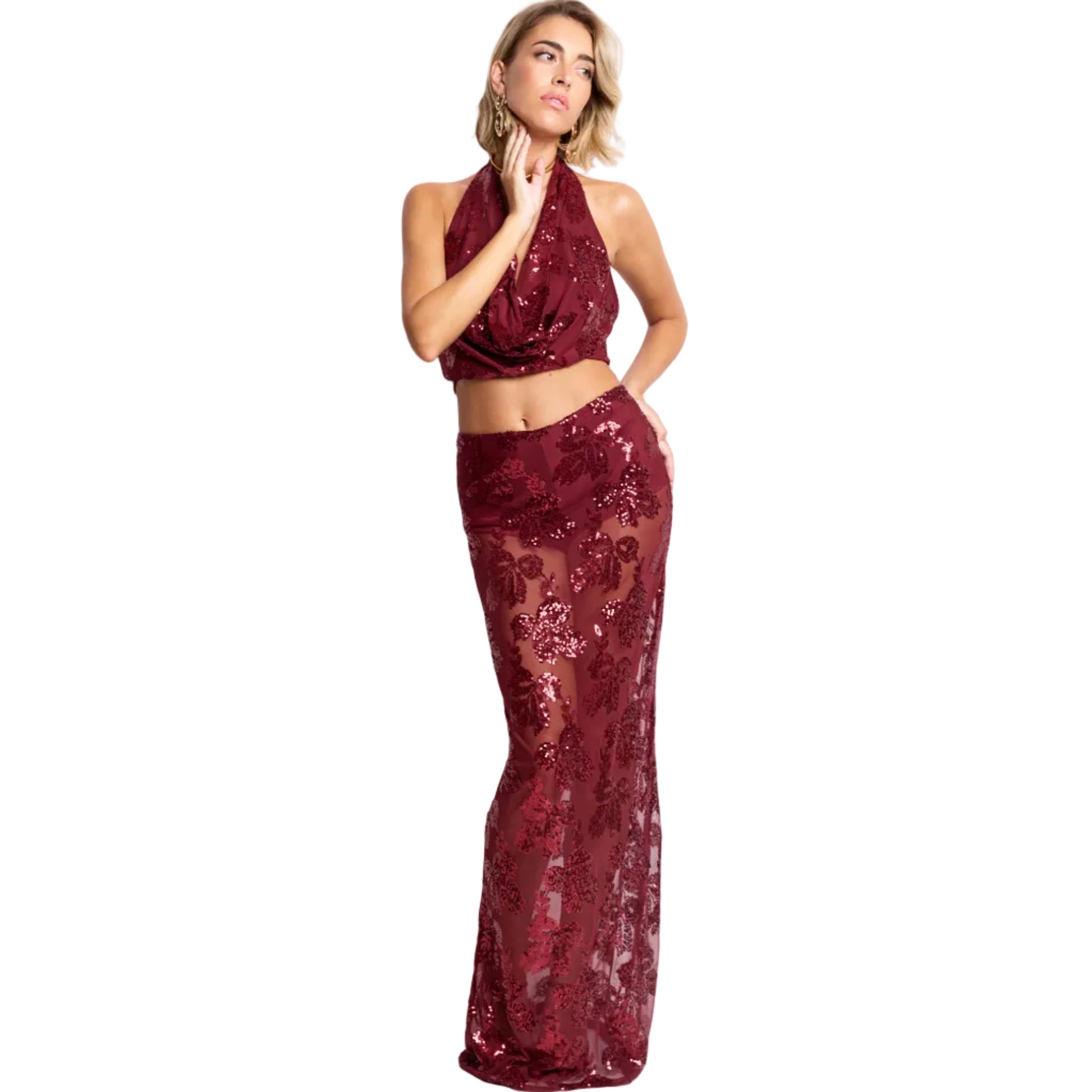 Le top met en valeur le décolleté et la jupe longue épouse la silhouette avec élégance.
