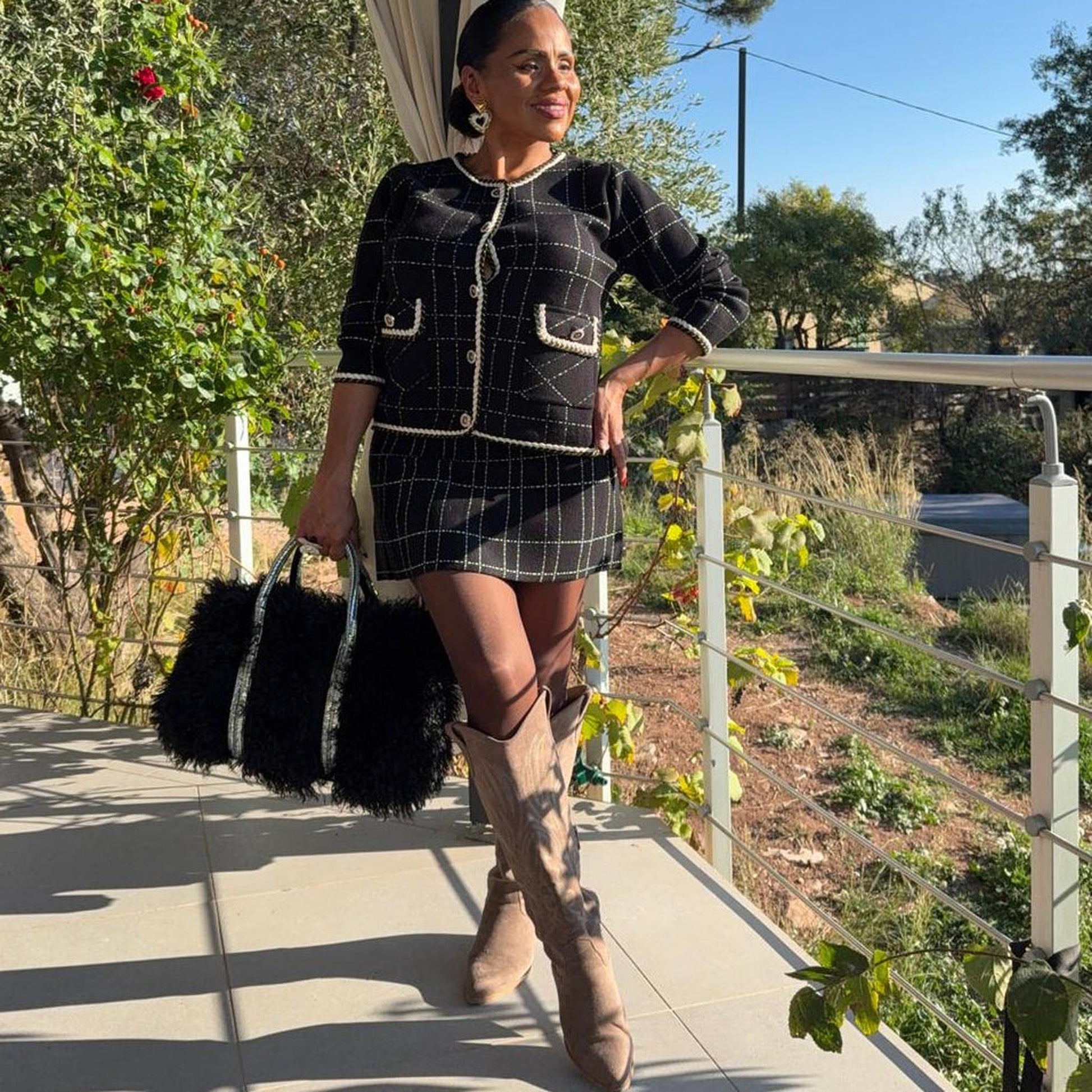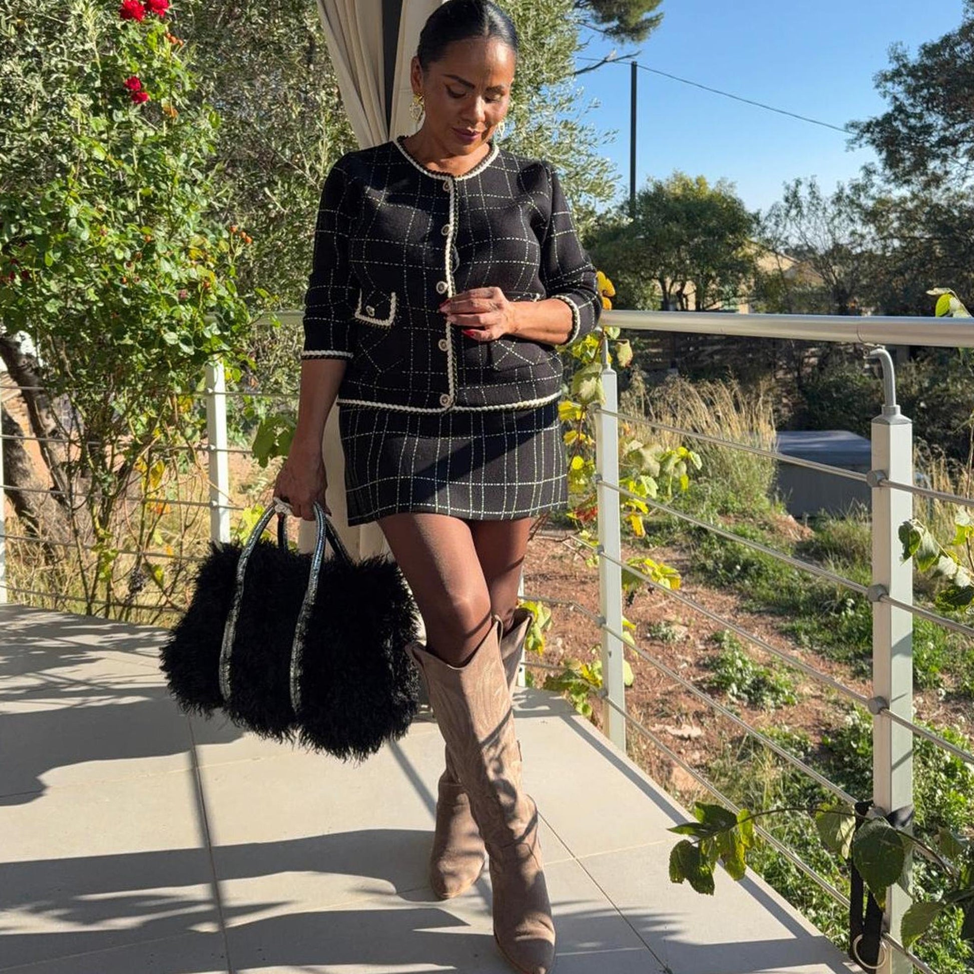 L’ensemble Chiara incarne l’élégance moderne avec son effet tailleur à carreaux et ses finitions tressées contrastées.