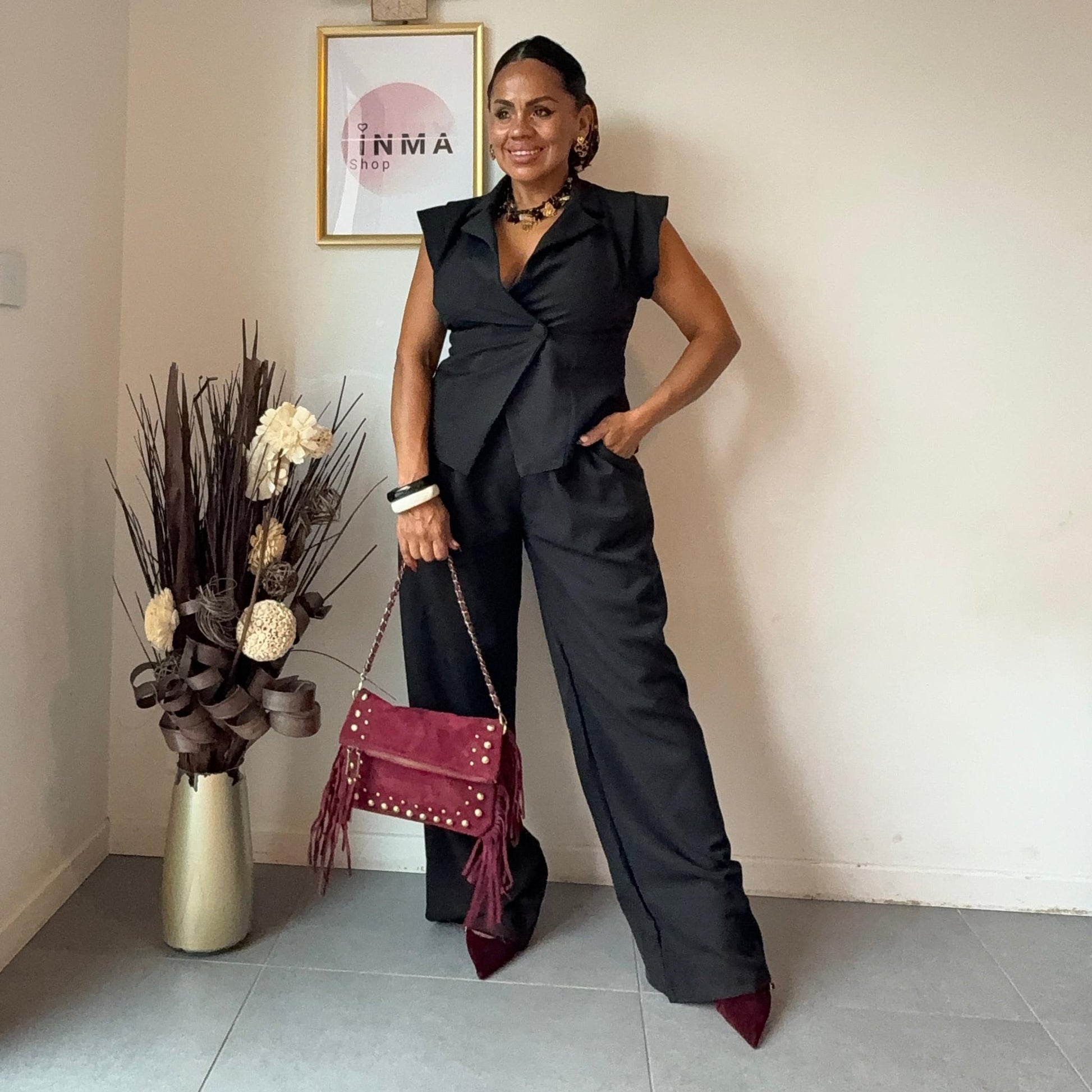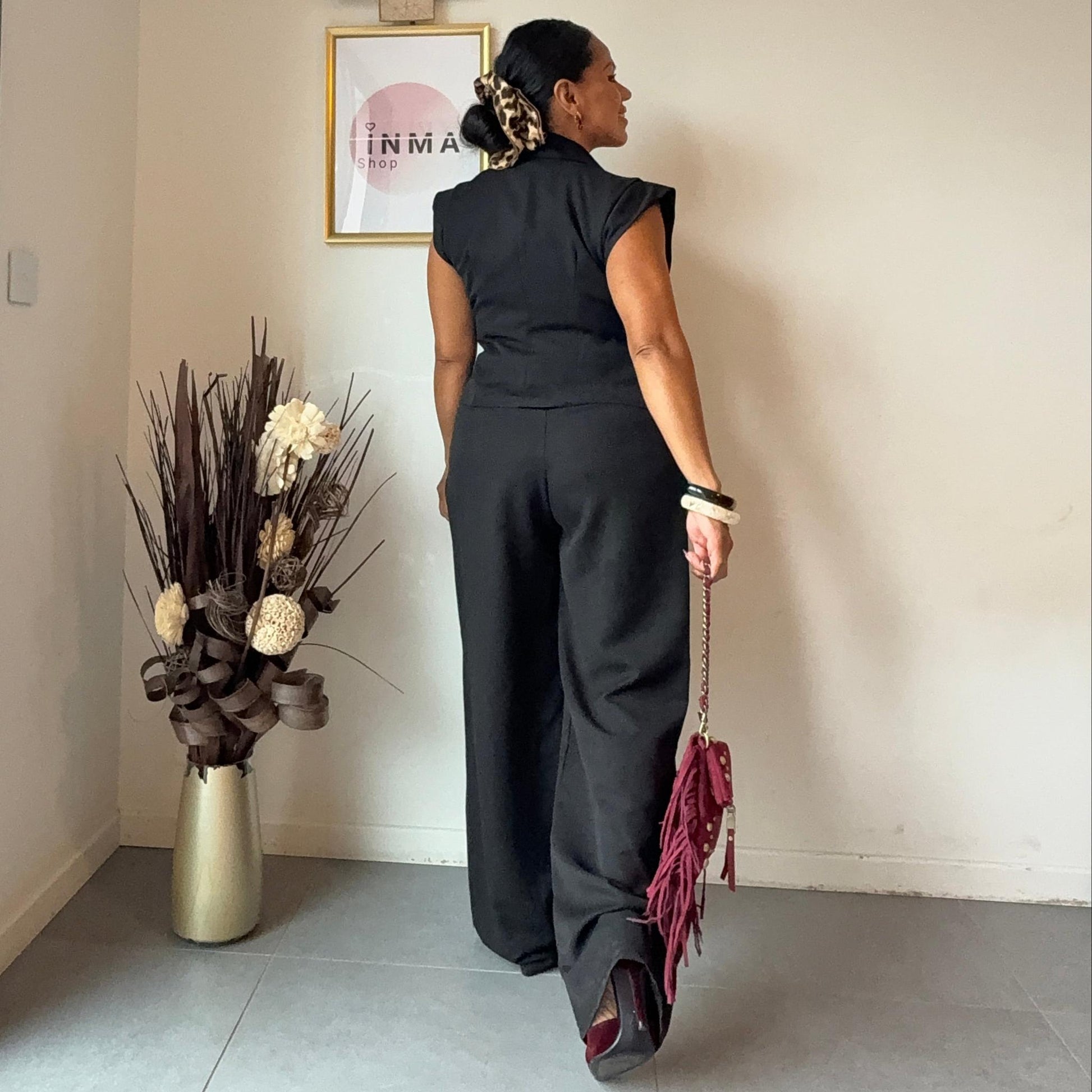 Le haut structuré souligne la taille avec féminité, tandis que le pantalon fluide et confortable allonge la silhouette.