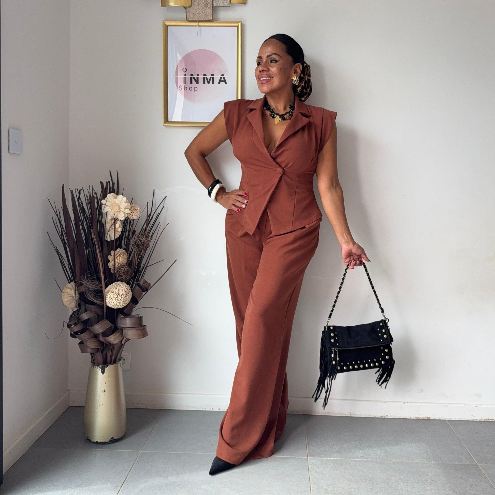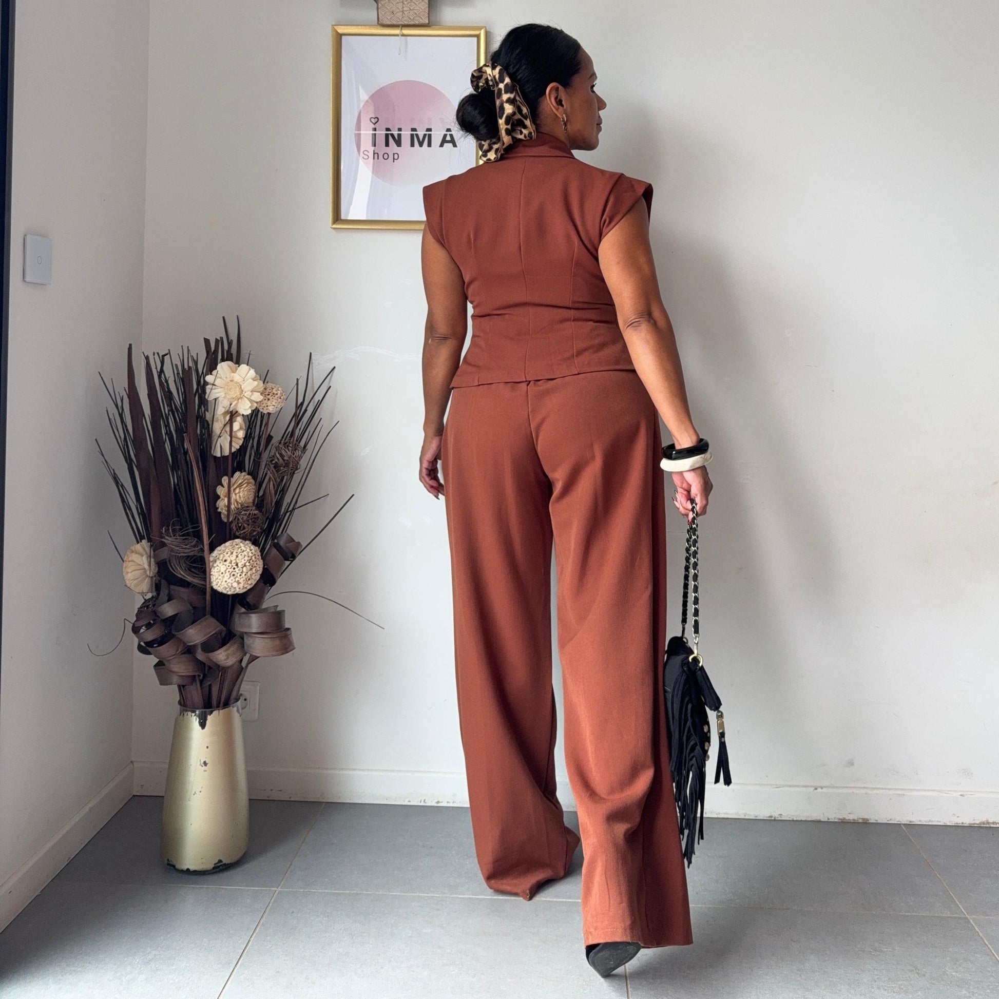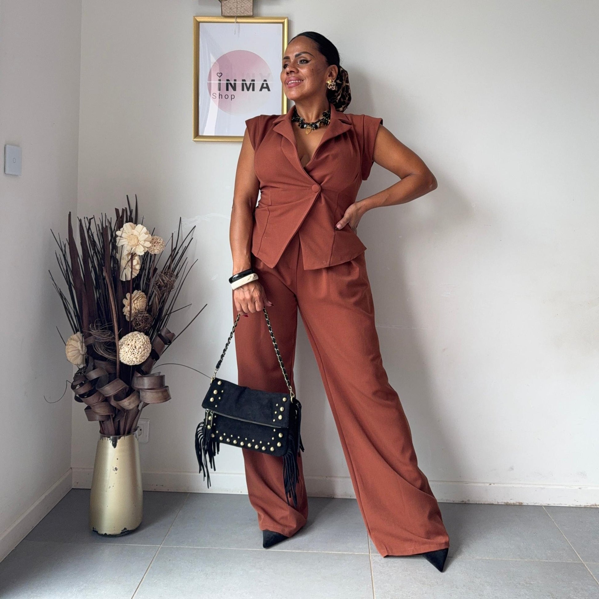 Disponible en noir intemporel ou en terracotta tendance, c’est une tenue qui se porte aussi bien au quotidien que pour une soirée. Mila est le choix idéal pour celles qui veulent conjuguer style et confiance. Taille unique, le haut convient jusqu’à une taille L et le pantalon jusqu'à une taille XL
