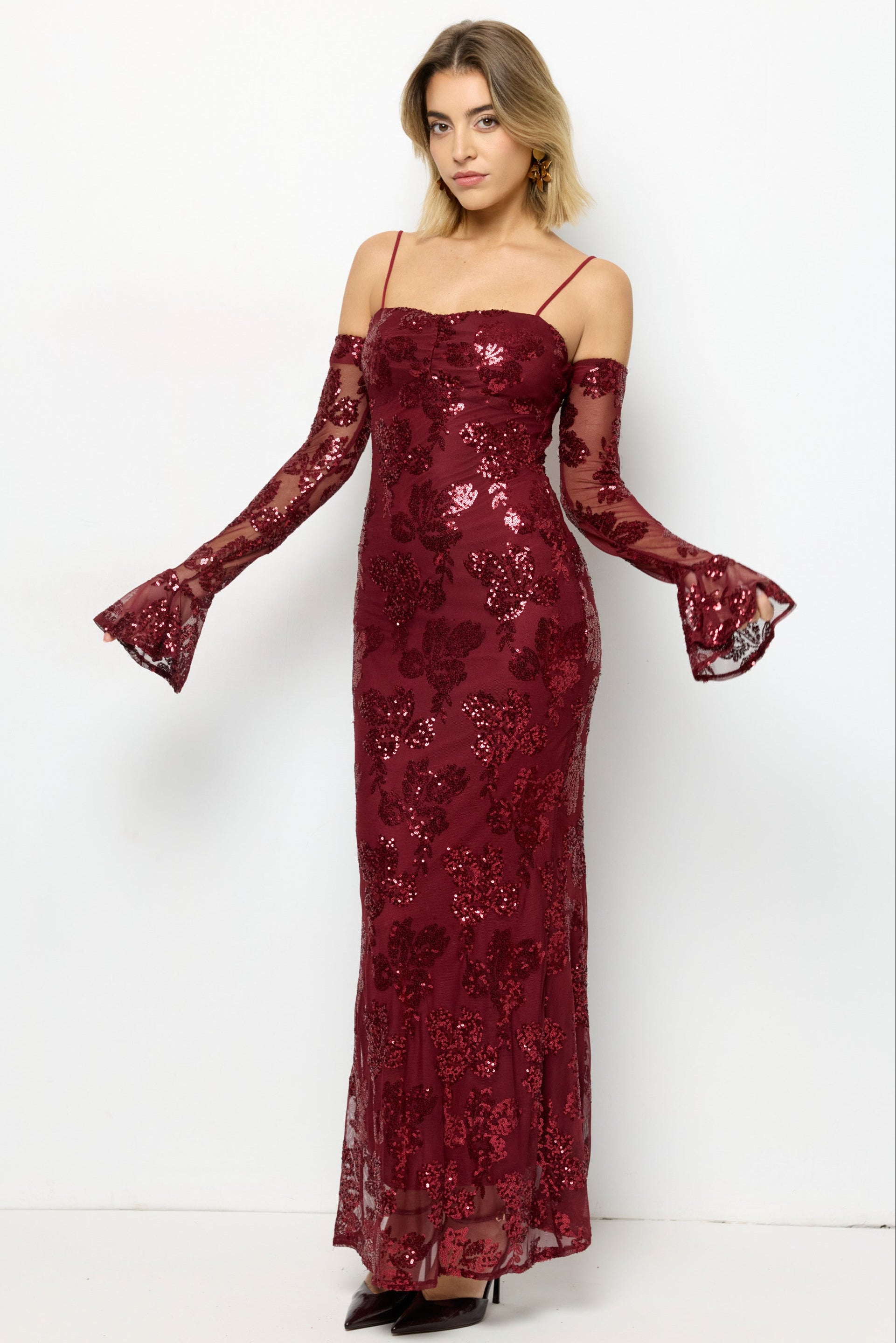• Manches : longues évasées, épaules dégagées (cold shoulder)