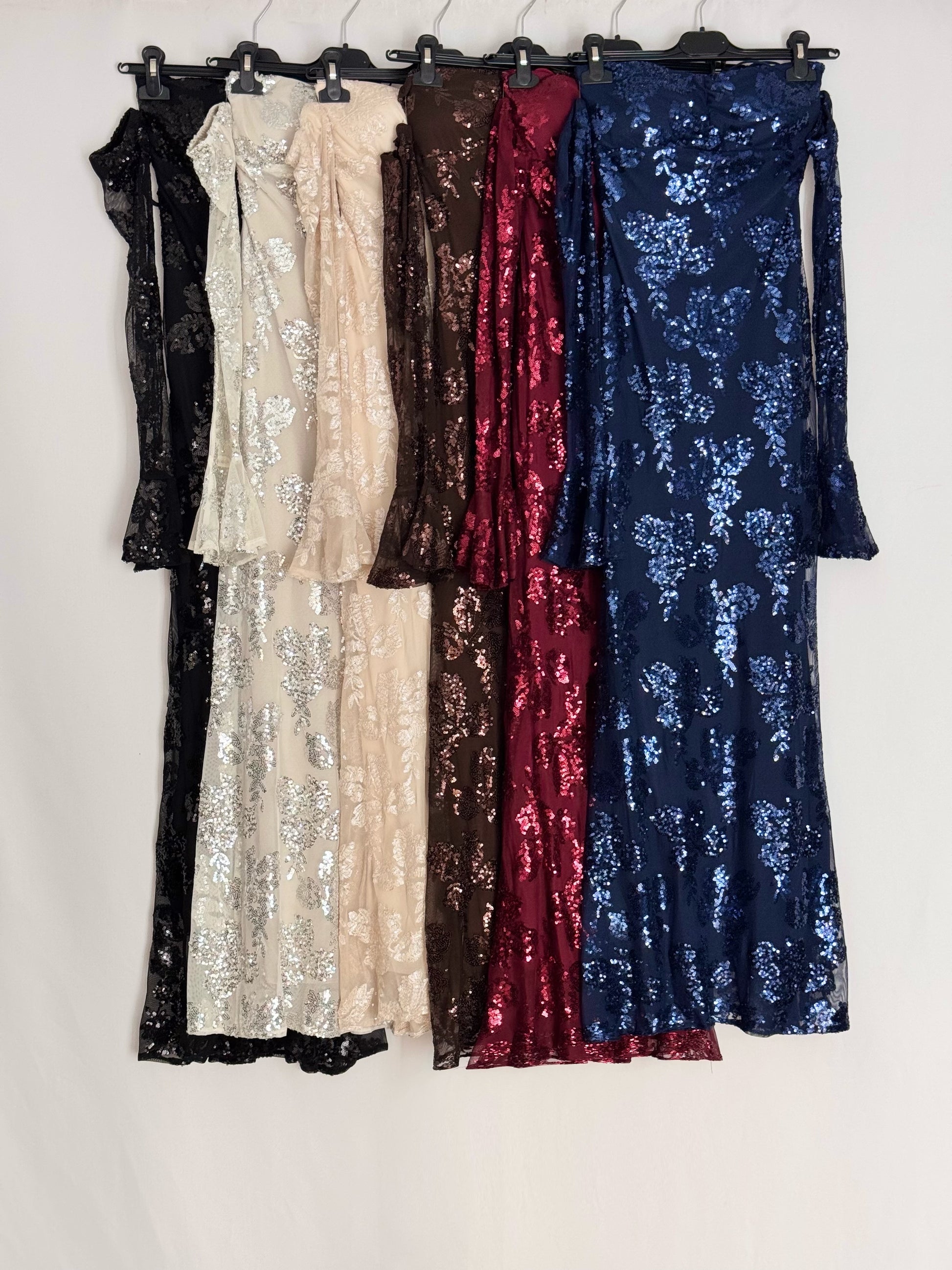 Une robe longue scintillante qui sublime la silhouette grâce à son tulle brodé recouvert de sequins éclatants. Sa coupe sirène met en valeur les courbes tout en restant confortable grâce à un tissu légèrement stretch.