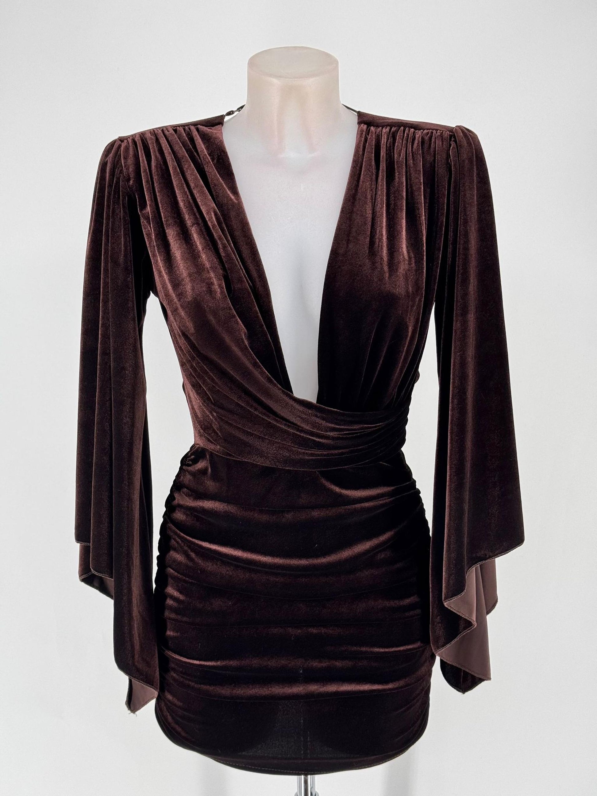 Ses manches longues évasées apportent une touche dramatique tandis que la coupe drapée et froncée sublime les courbes en allongeant la silhouette.