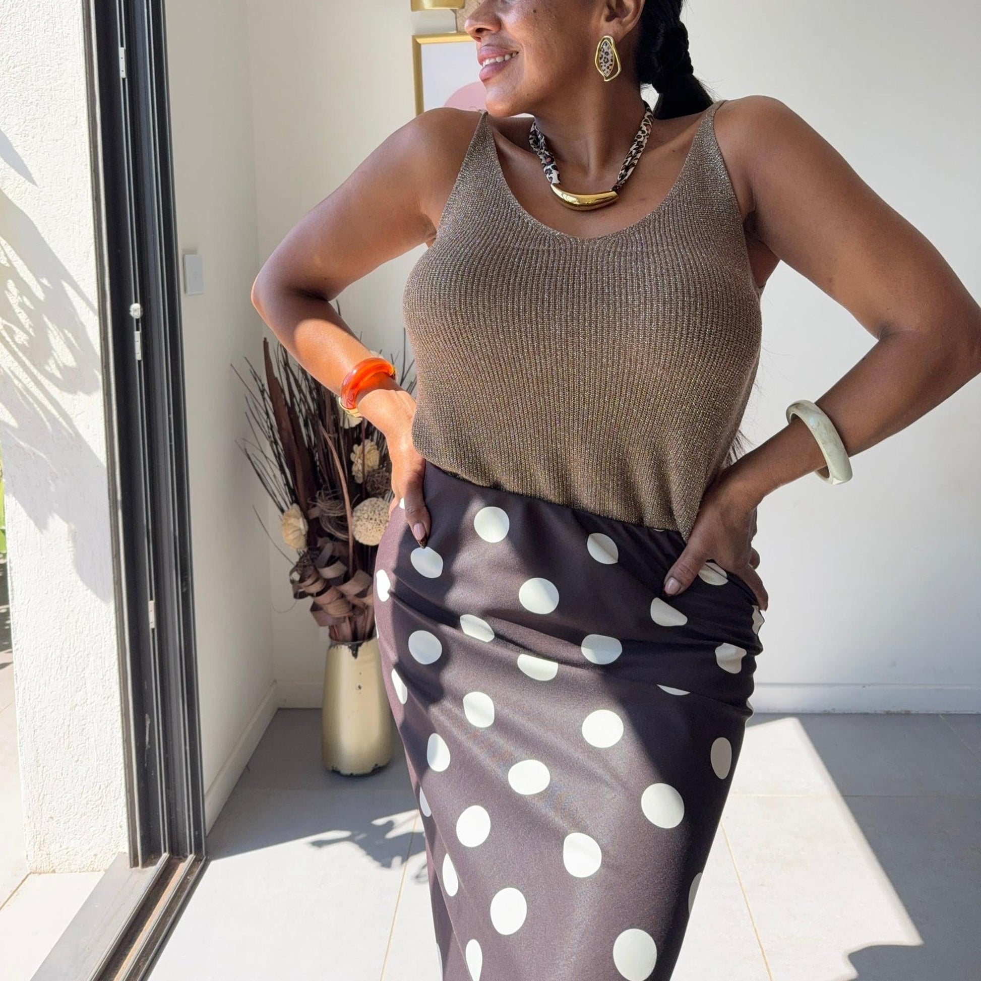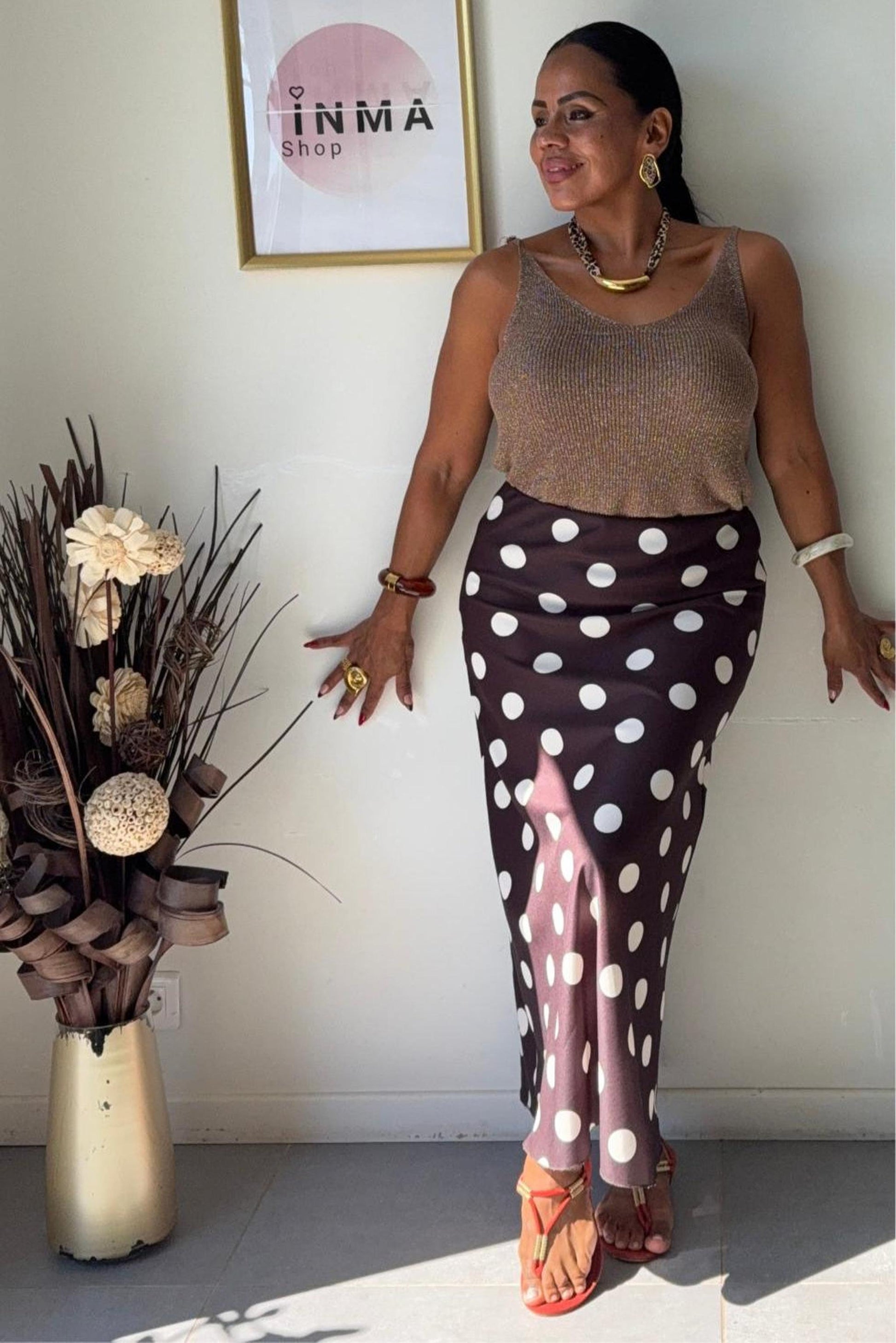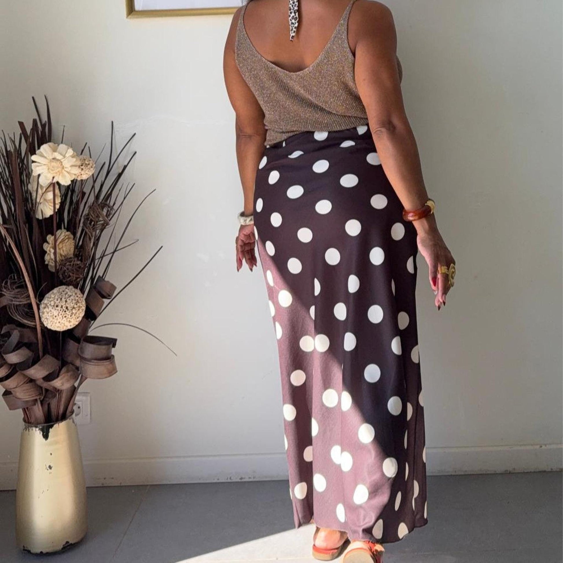La jupe à pois revient en force dans un style à la fois intemporel et tendance. Avec sa coupe fluide et son imprimé chic, elle sublime toutes les silhouettes.