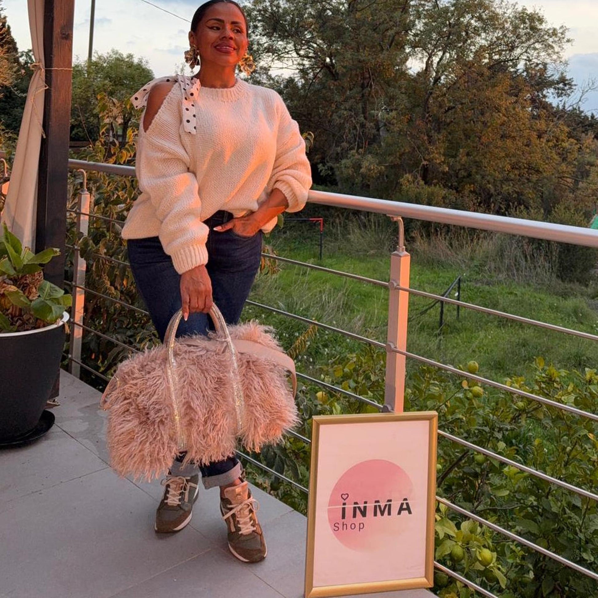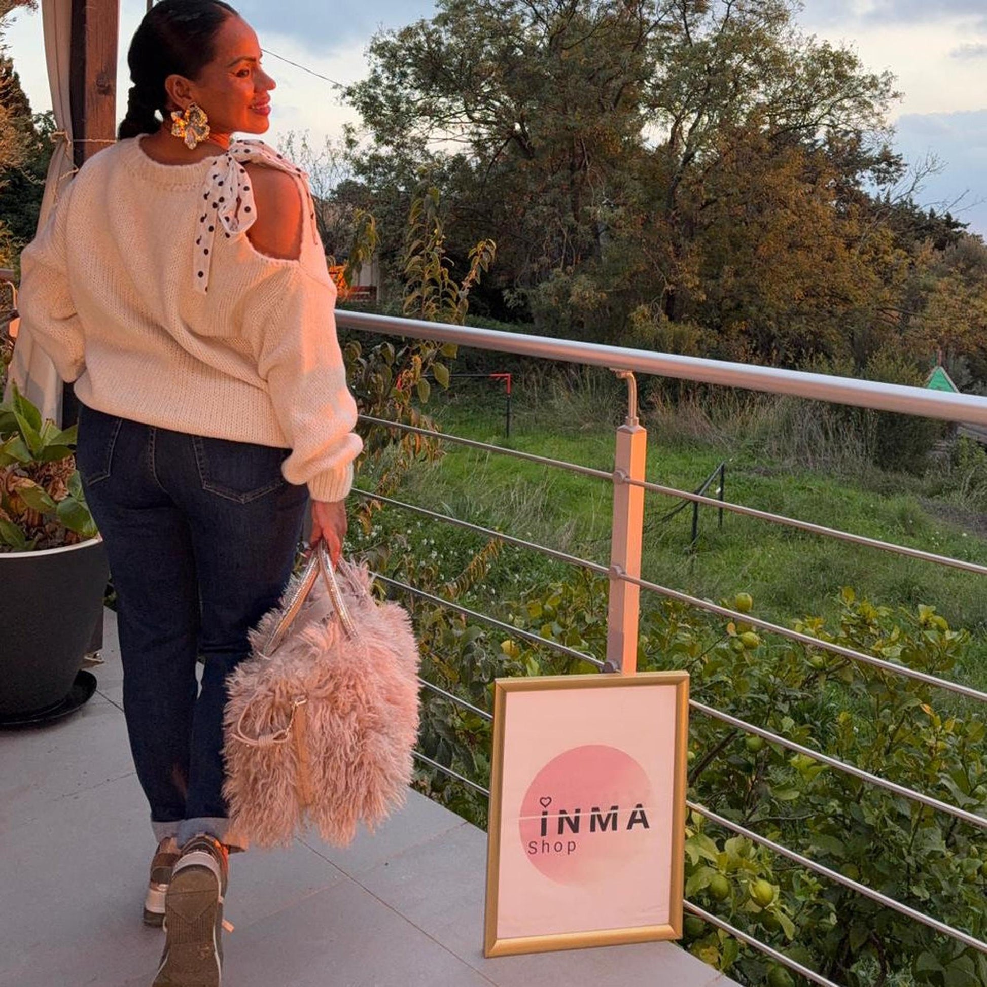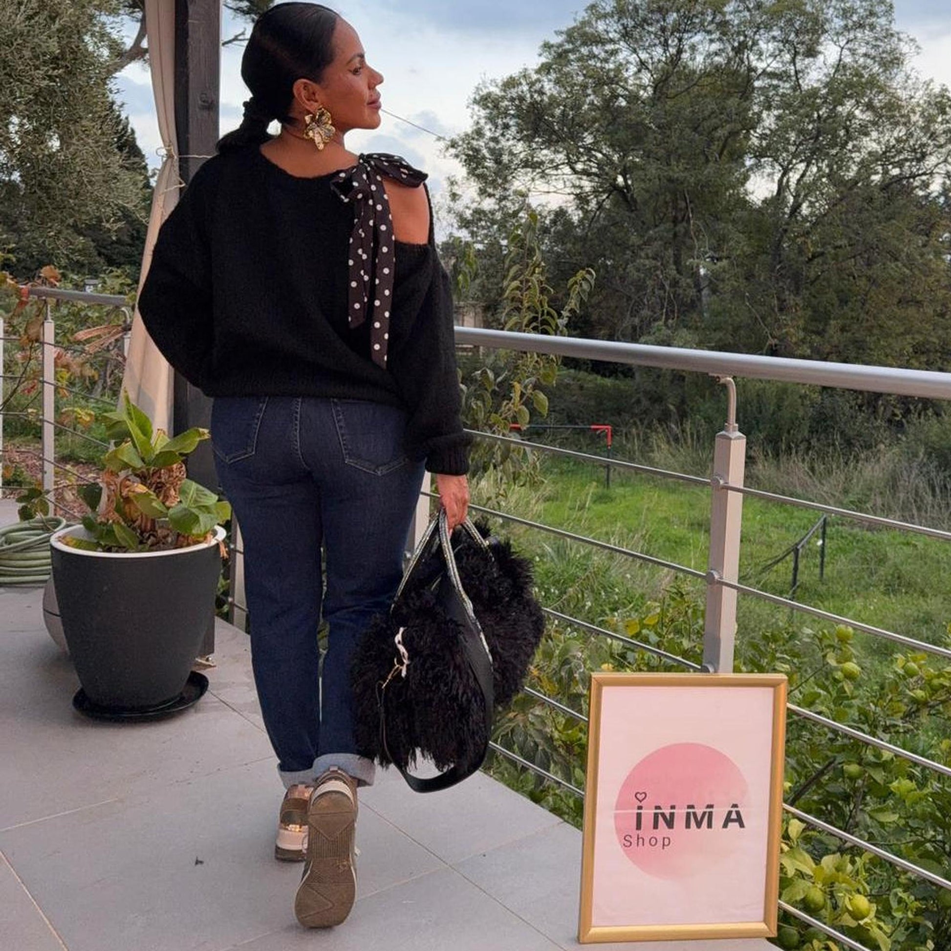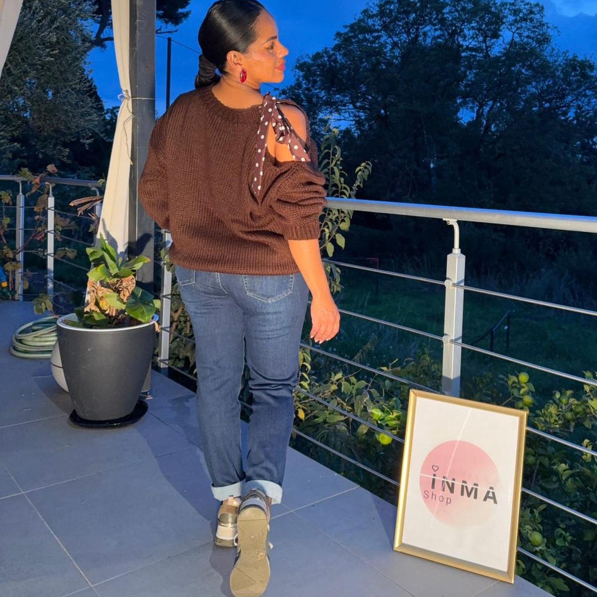 Le pull Mumu séduit par sa coupe ample et féminine, mise en valeur par une ouverture sur l’épaule ornée d’un nœud à pois.