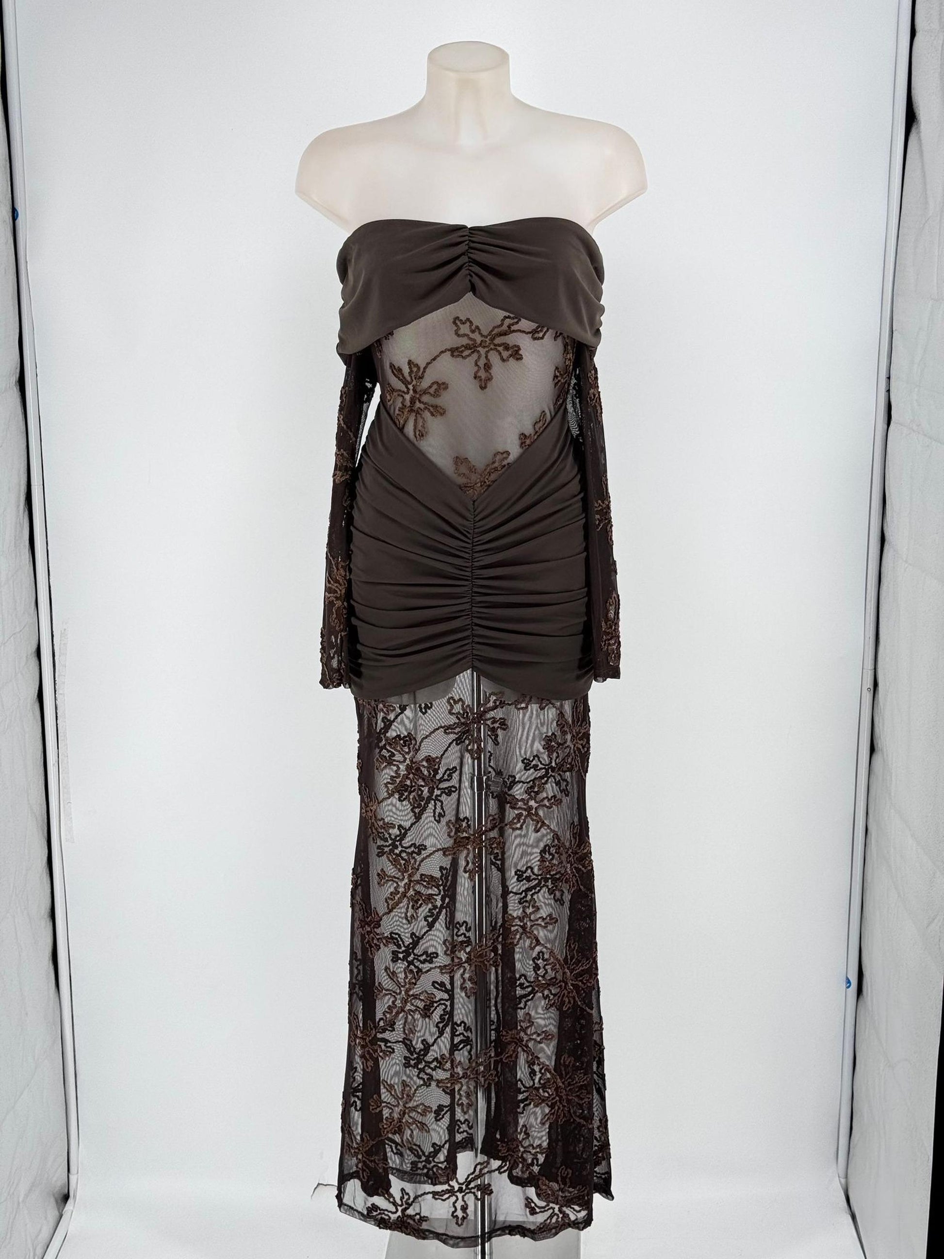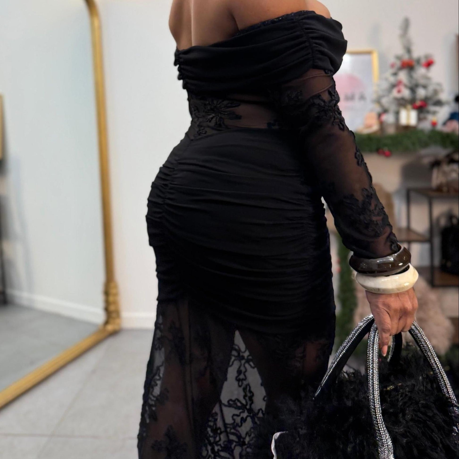 Une robe longue en dentelle transparente qui redessine la silhouette avec élégance. Son bustier drapé met en valeur les épaules, tandis que le jeu de transparence sublime chaque mouvement.