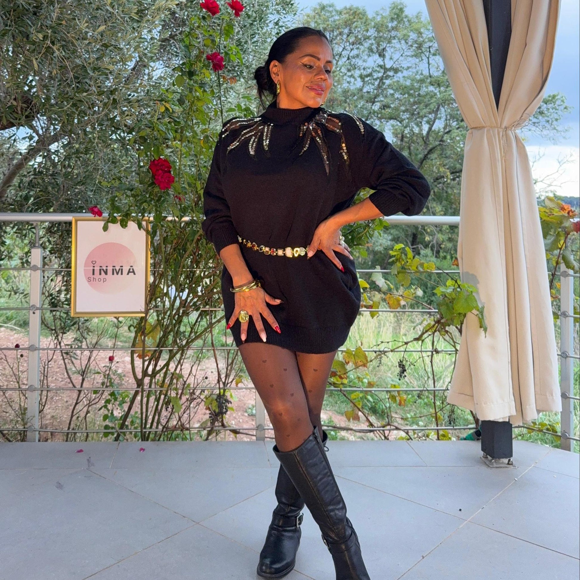 La robe pull Isadora combine confort et glamour. Sa maille douce épouse la silhouette, tandis que les broderies dorées sur les épaules captent la lumière avec élégance.