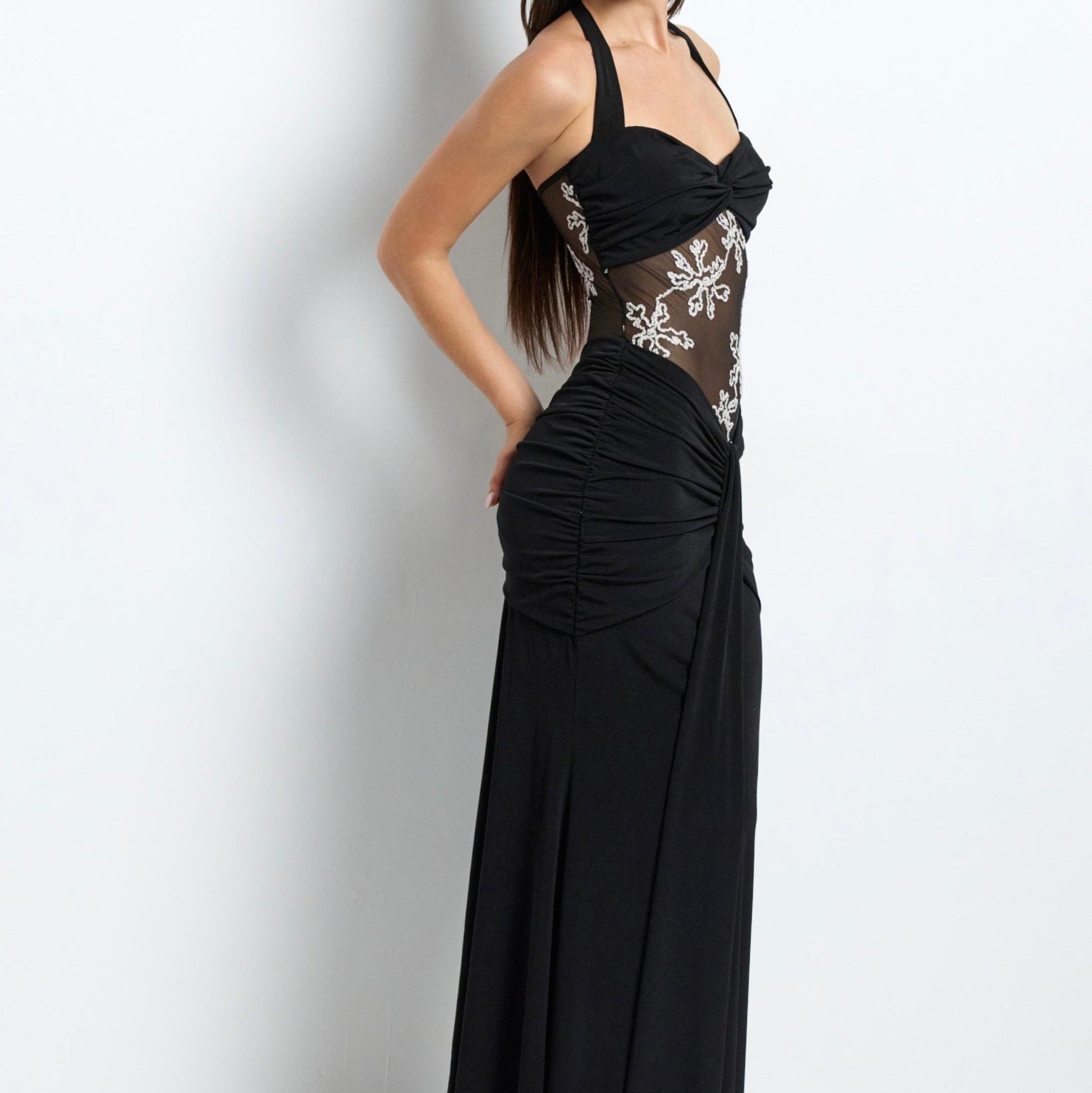 Le dos nu noué met en valeur la nuque et les épaules, tandis que le drapé au niveau des hanches crée un effet sculptant et extrêmement flatteur.