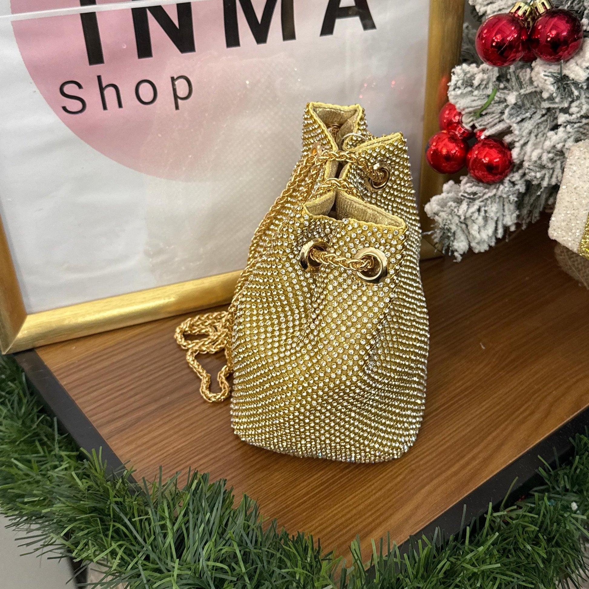 Petit sac seau entièrement orné de strass, idéal pour illuminer une tenue de soirée ou ajouter une touche élégante à un look du quotidien.