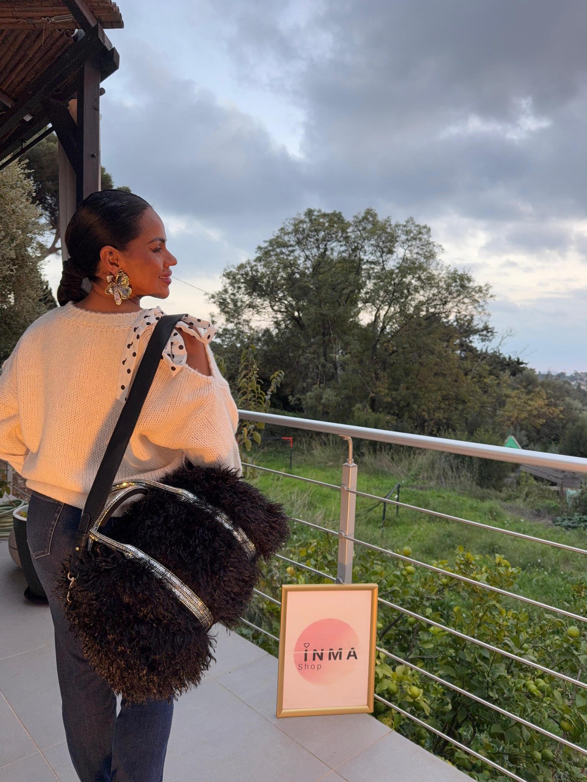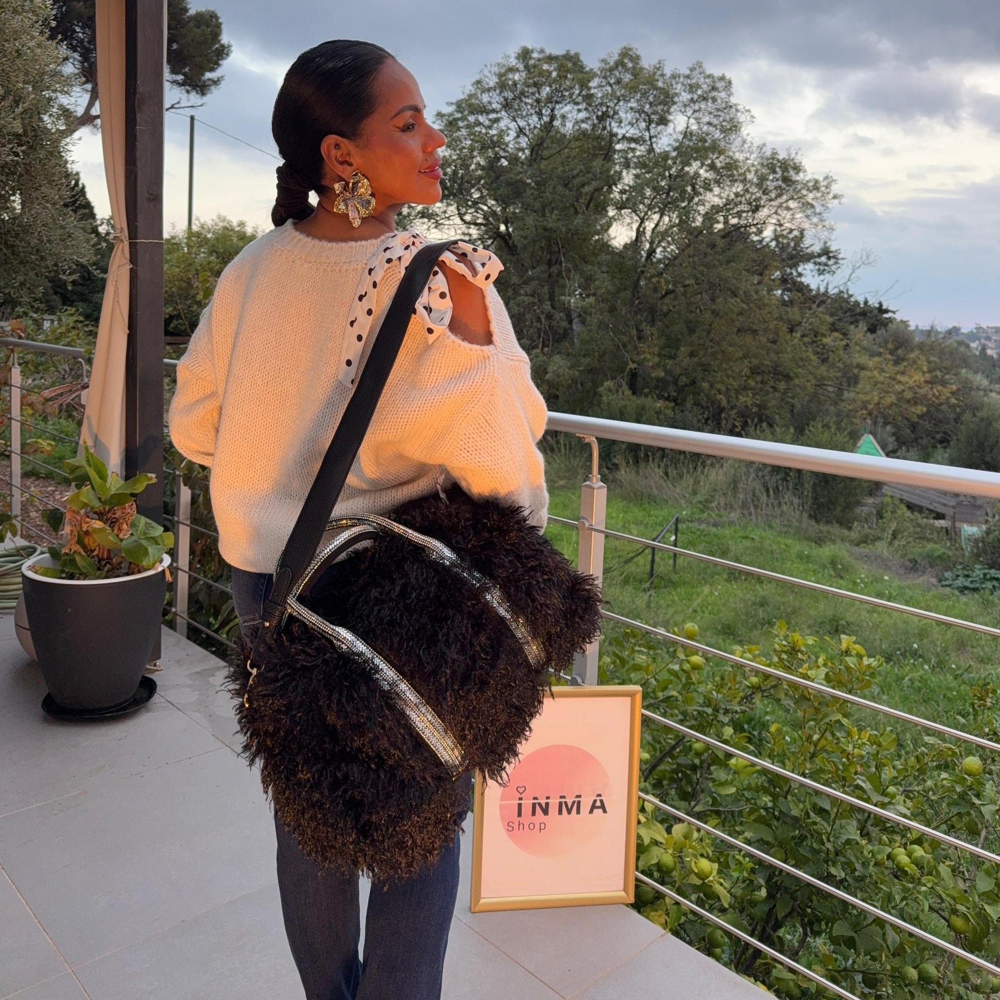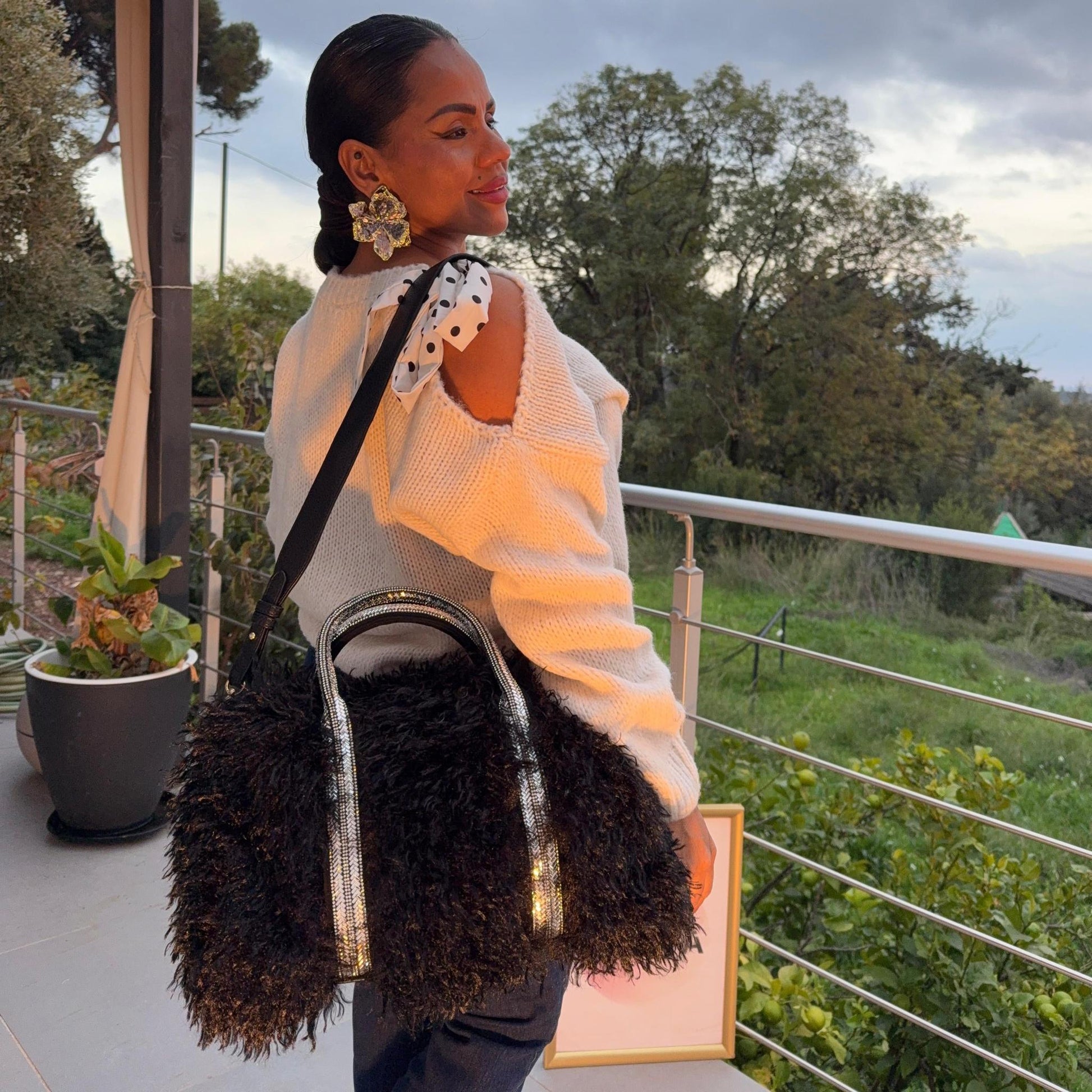 Détails : fausse fourrure douce, anses strassées, bandoulière réglable