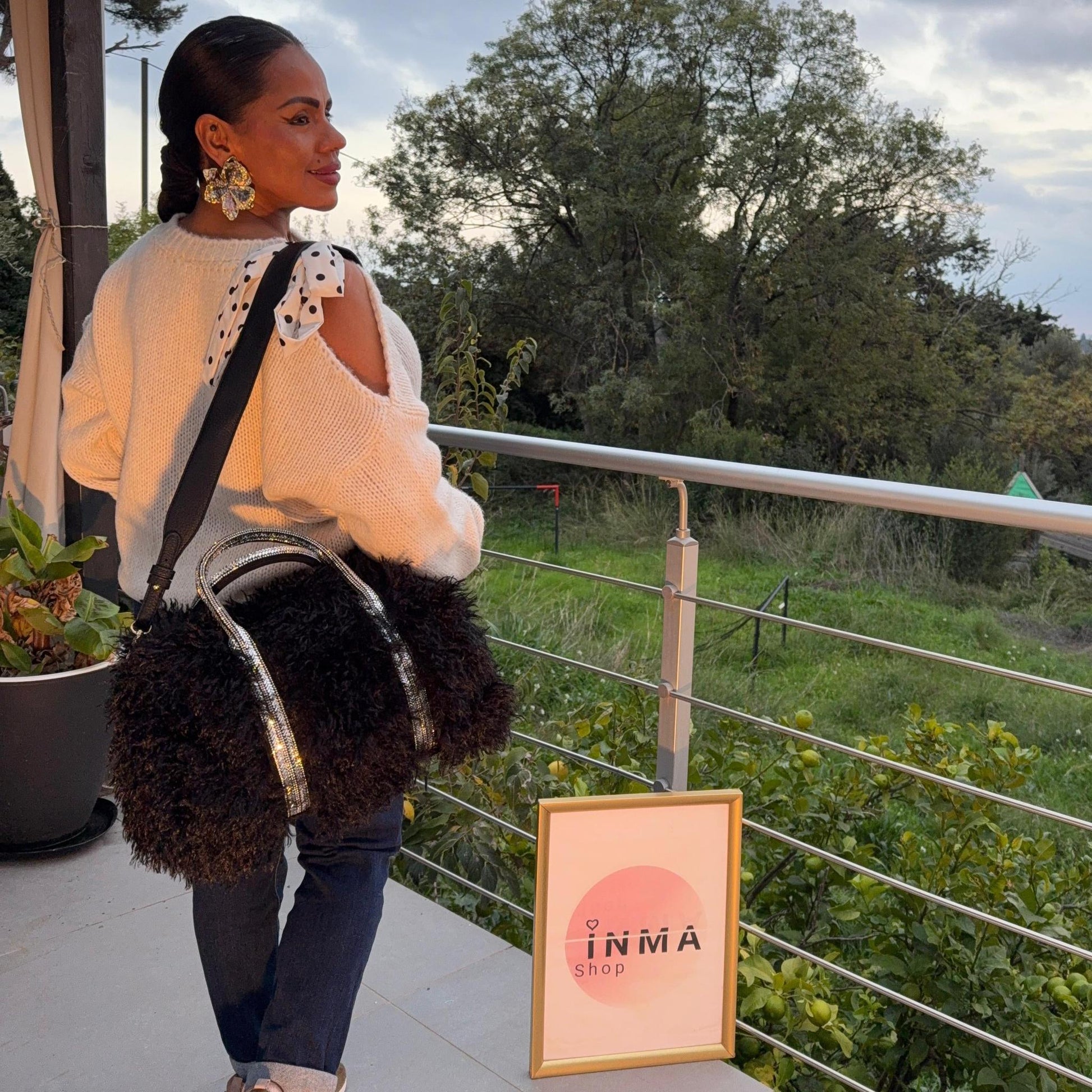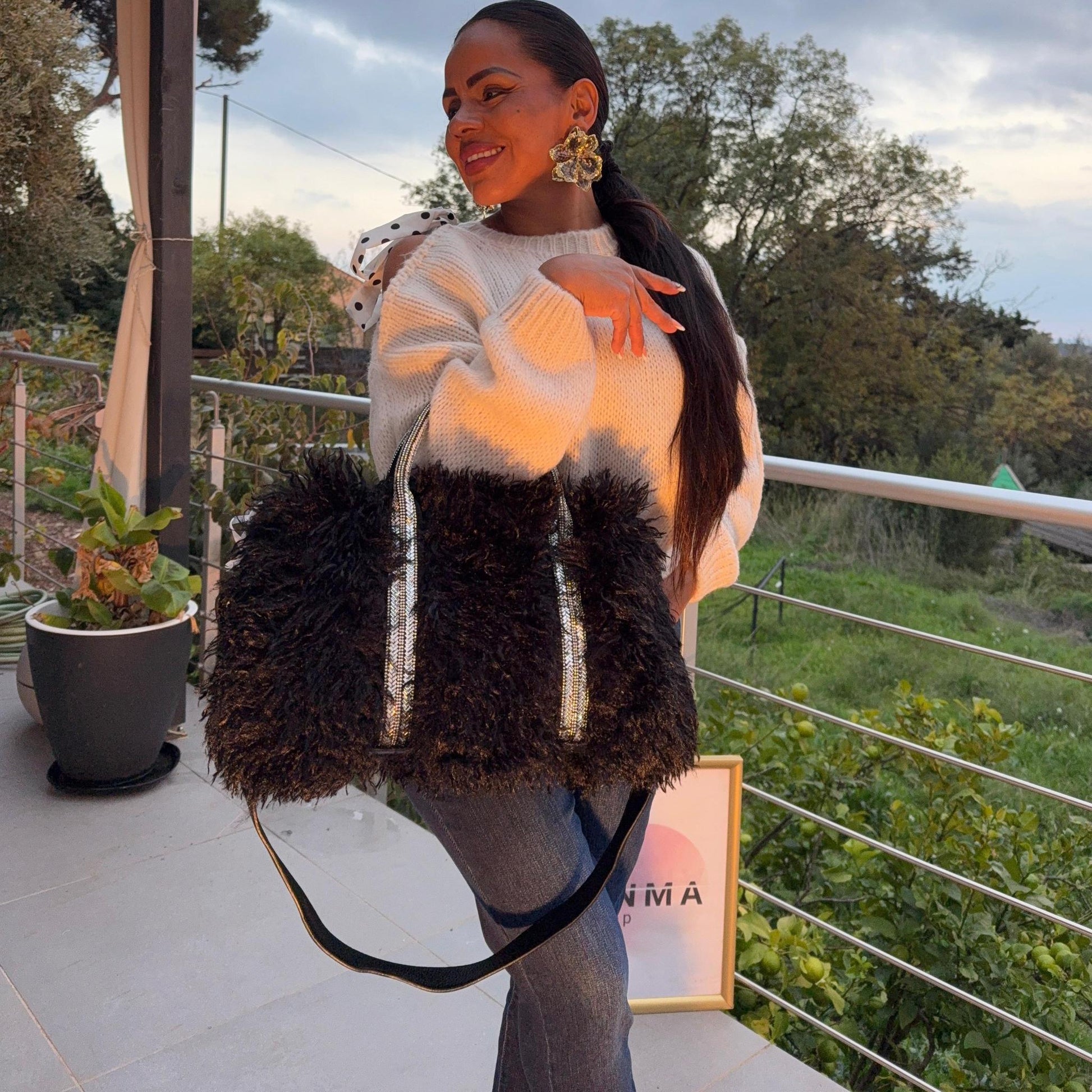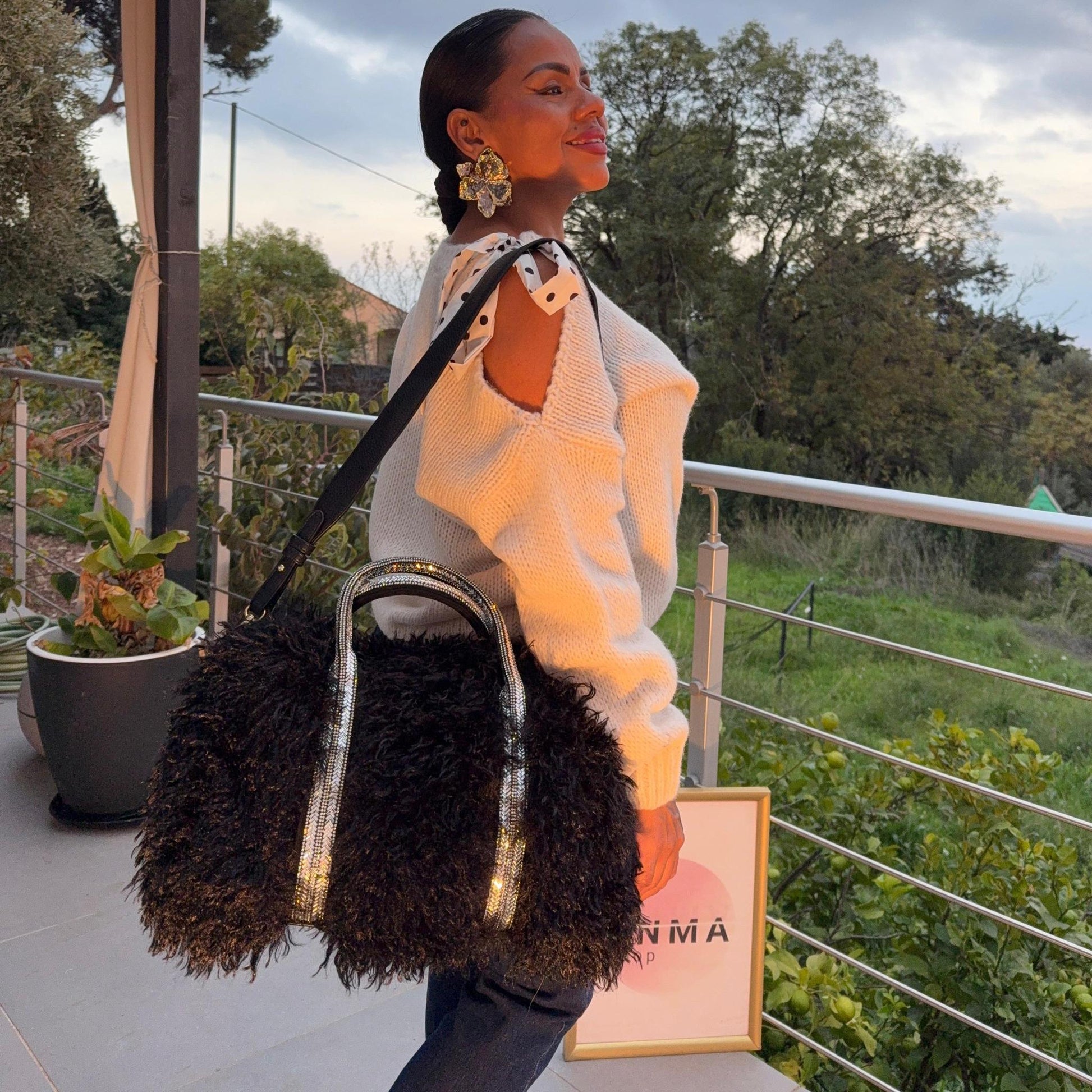 Le sac Amour allie fantaisie et élégance avec sa fausse fourrure moelleuse et ses anses scintillantes ornées de strass.