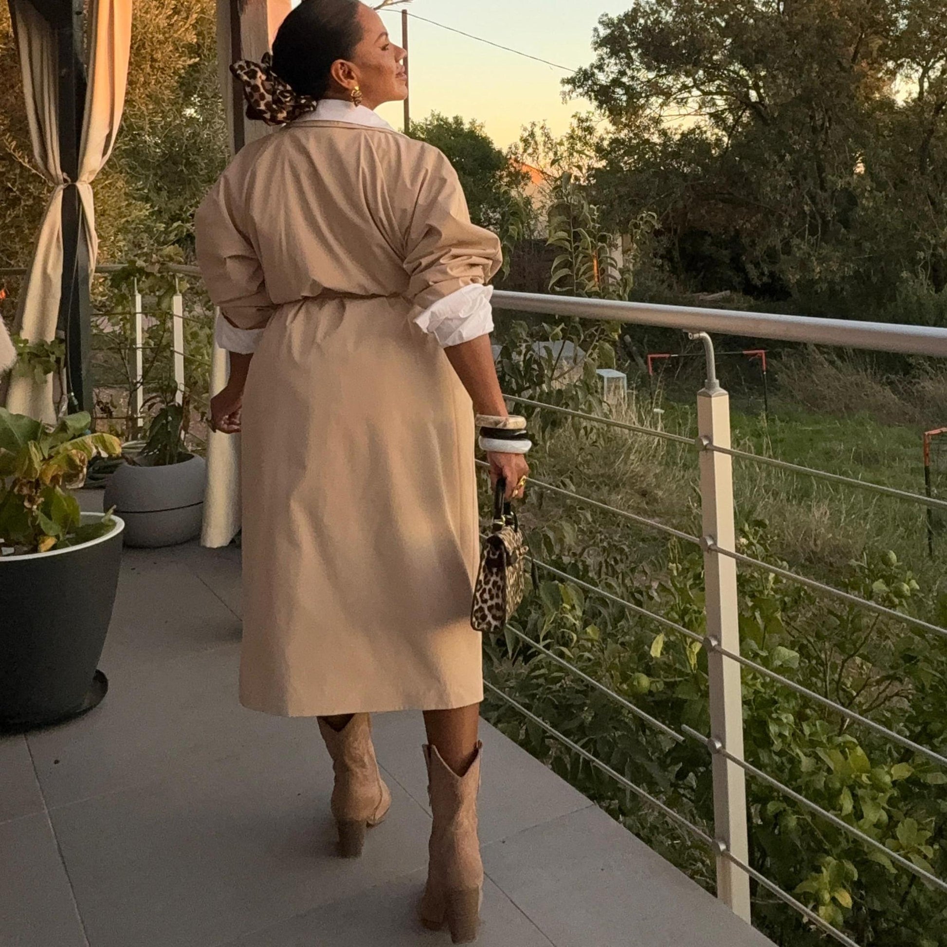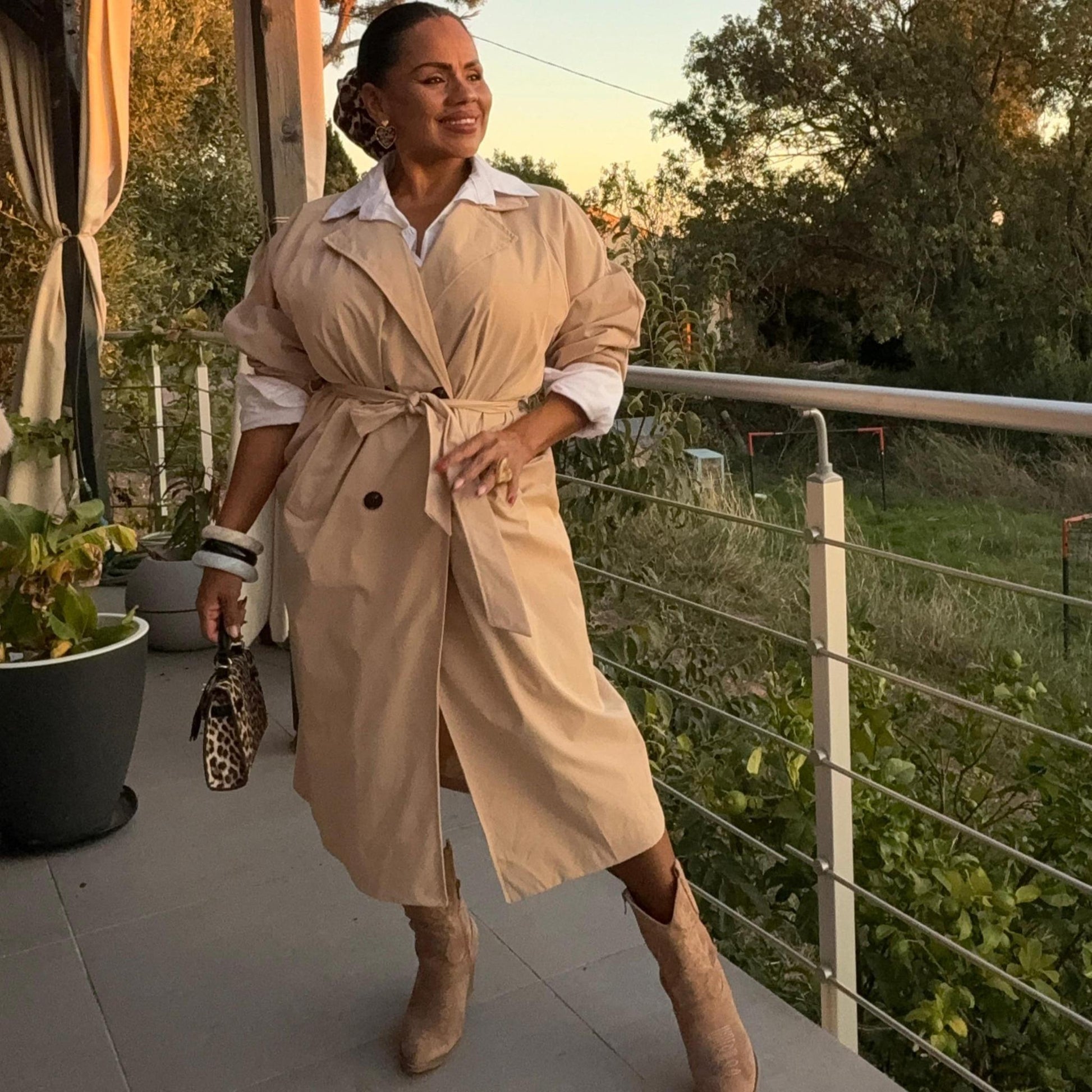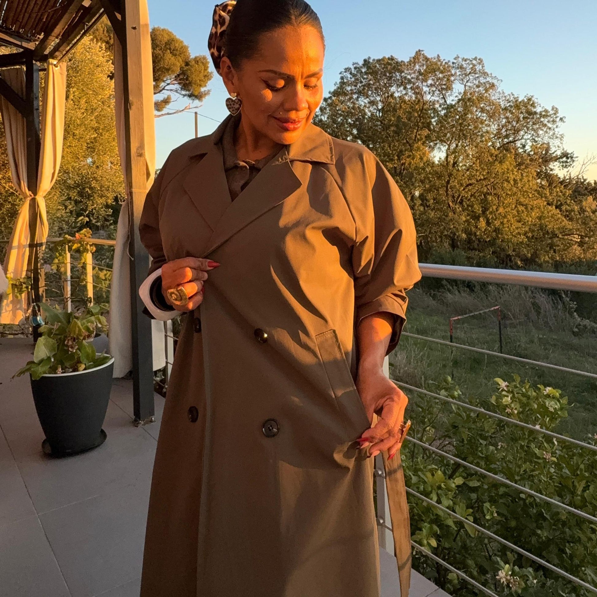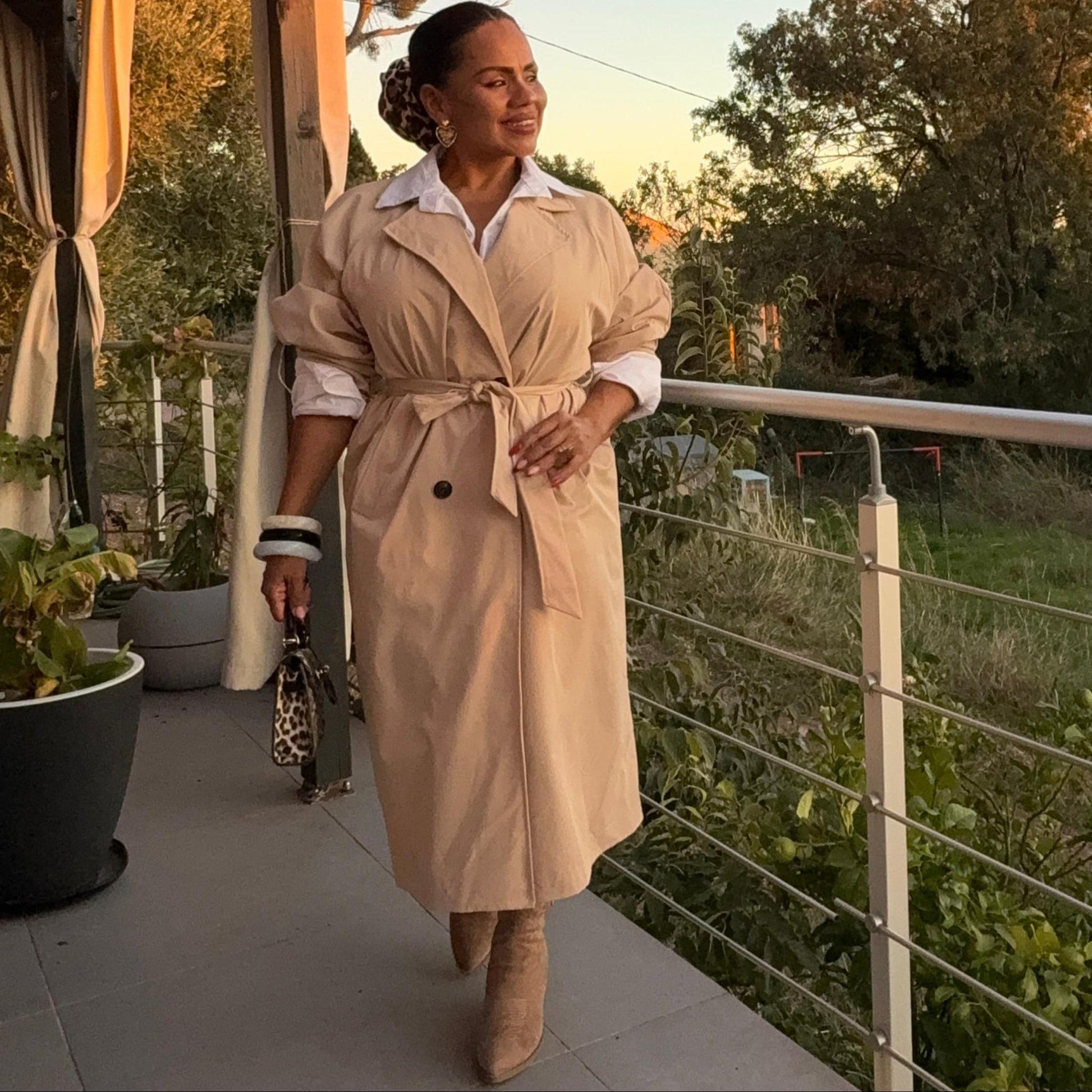 Le trench Elisa incarne le chic naturel et la confiance tranquille. Avec sa coupe fluide, ses manches légèrement bouffantes et sa ceinture à nouer, il redessine la silhouette sans effort.