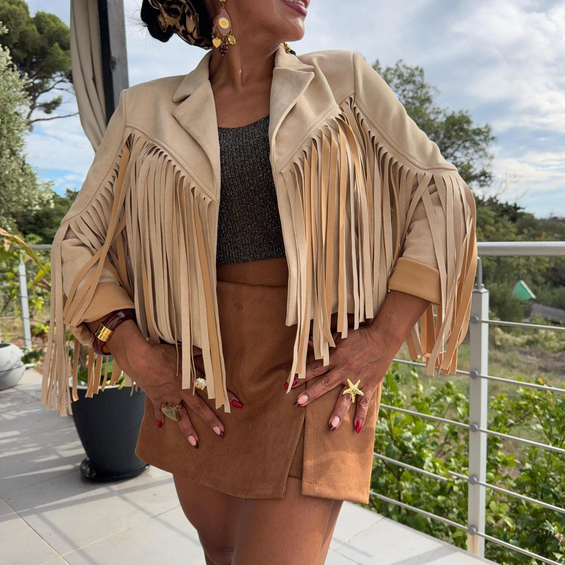 La Veste Dakota est la pièce forte qui apporte instantanément du style à vos tenues. Inspirée de l’univers western, elle séduit avec ses longues franges en suédine qui bougent au rythme de vos pas, ajoutant du mouvement et une touche bohème irrésistible.