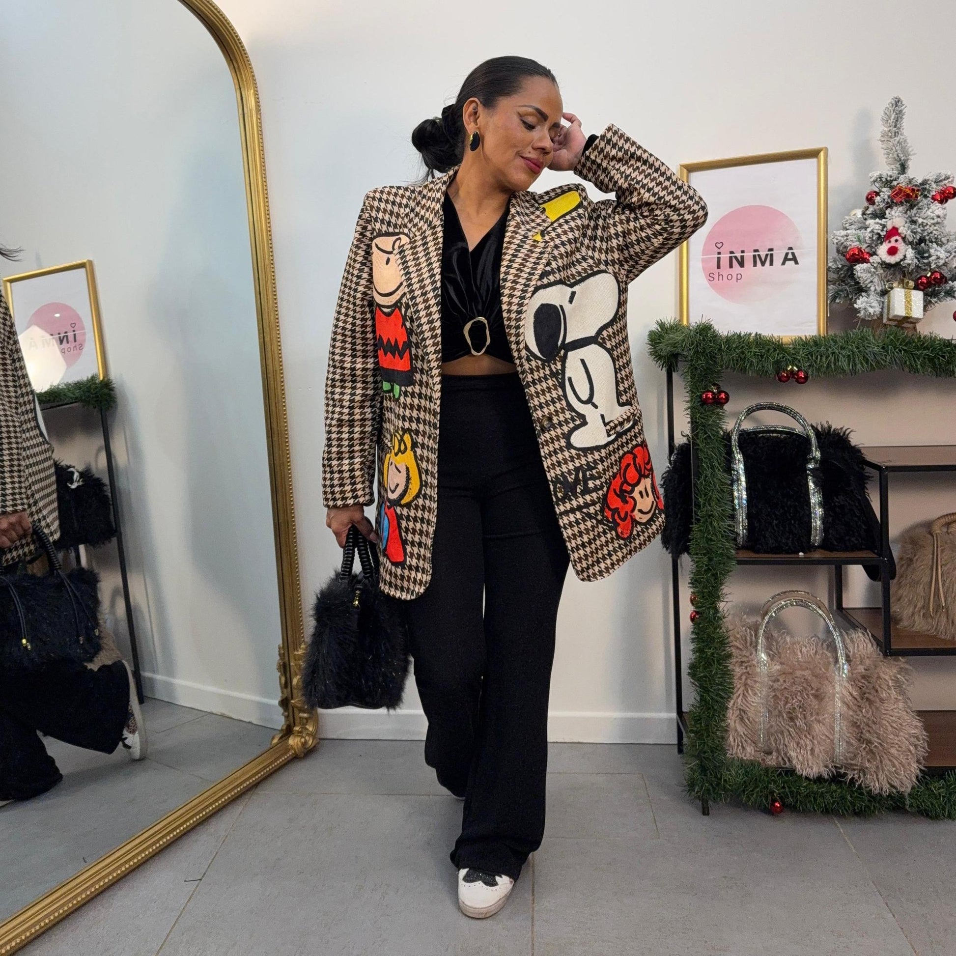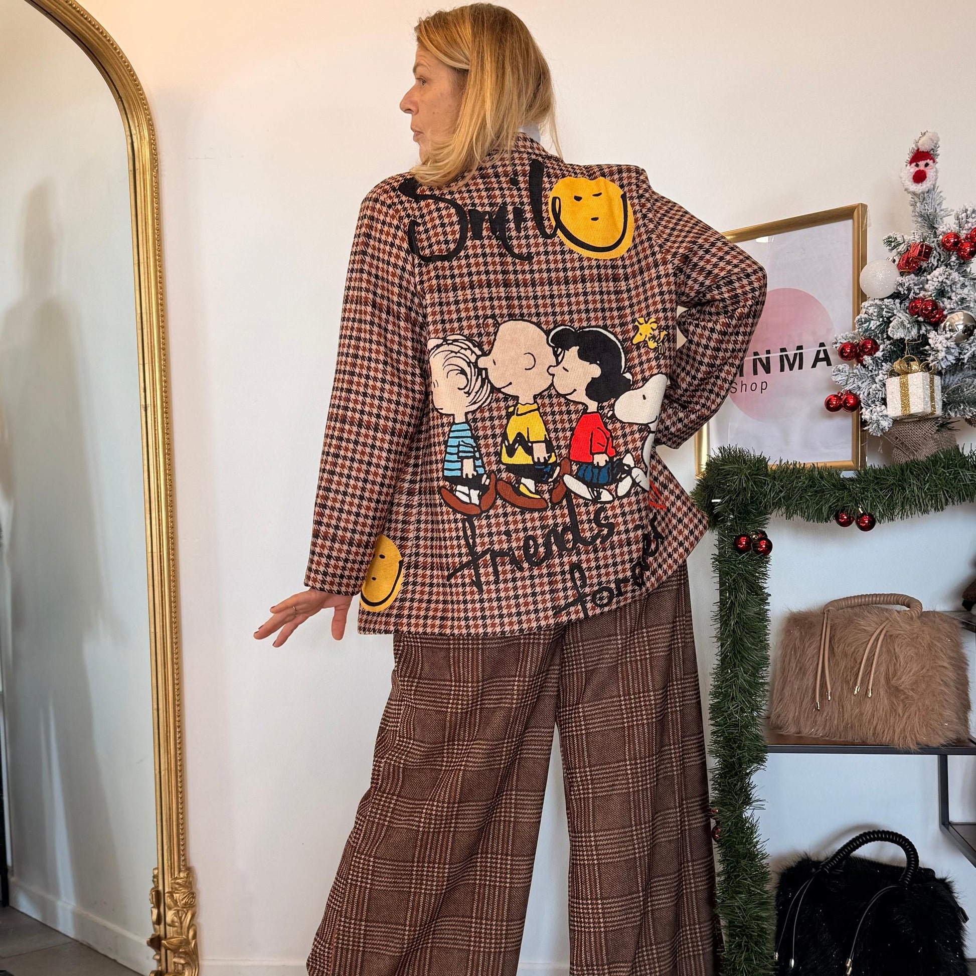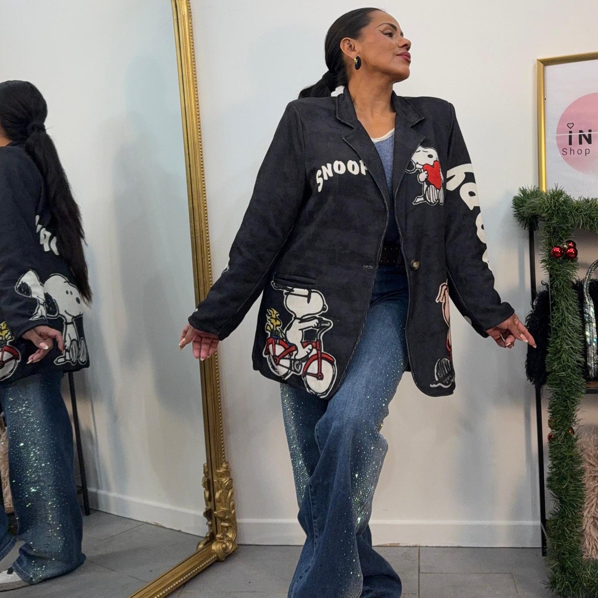 Une veste oversize au look cartoon irrésistible ! Motifs Snoopy et Peanuts brodés tout autour, coupe droite confortable et style street chic assumé.