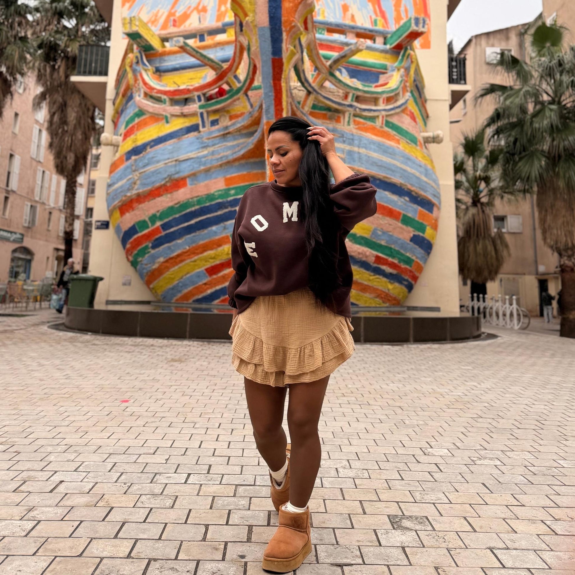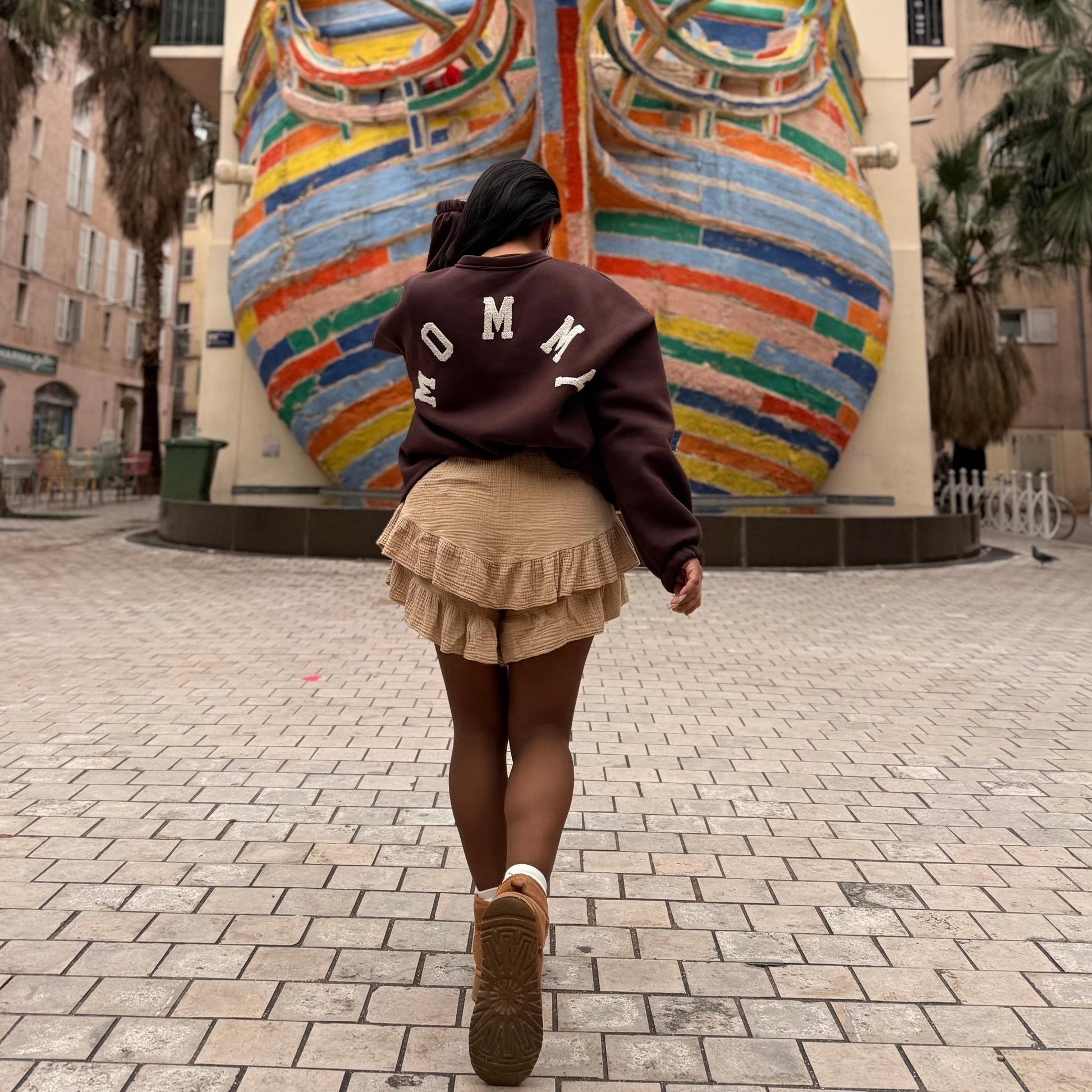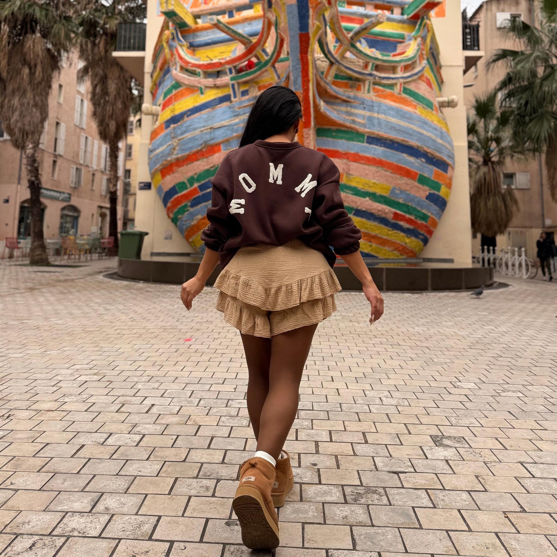 Confectionné dans une matière douce et agréable à porter, il se porte facilement avec une jupe, un jean ou un short pour un look casual chic. Sa teinte coffee, chaleureuse et facile à associer, en fait un indispensable de saison.